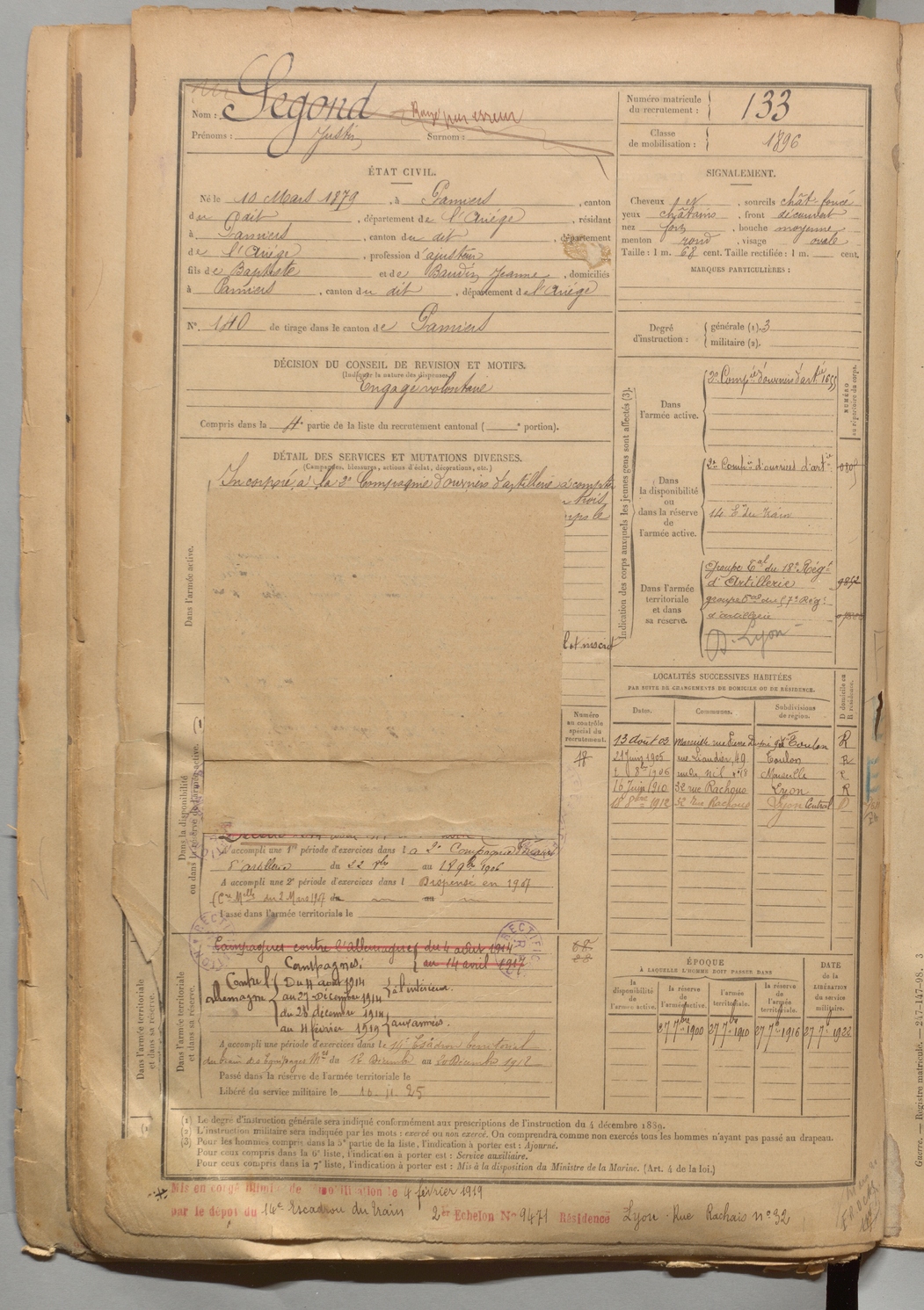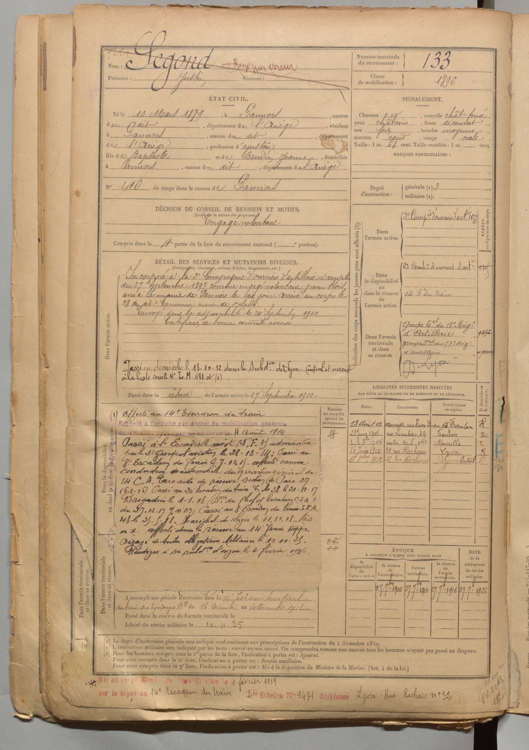 | Segond | Justin | FOIX | 1 R 456 | 1899 | Pamiers | Pamiers | 133 |