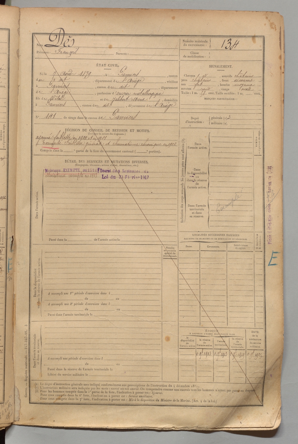 | Dès | François | FOIX | 1 R 456 | 1899 | Pamiers | Pamiers | 134 |