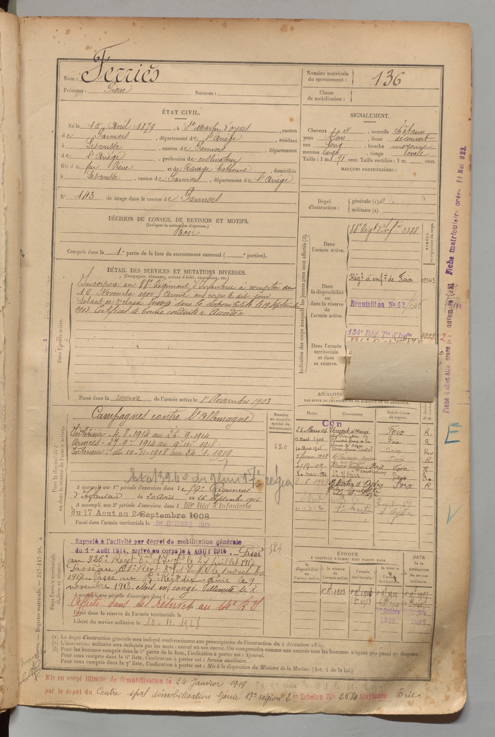 | Ferriès | Pierre | FOIX | 1 R 456 | 1899 | Saint-Martin-d'Oydes | Lescousse | 136 |