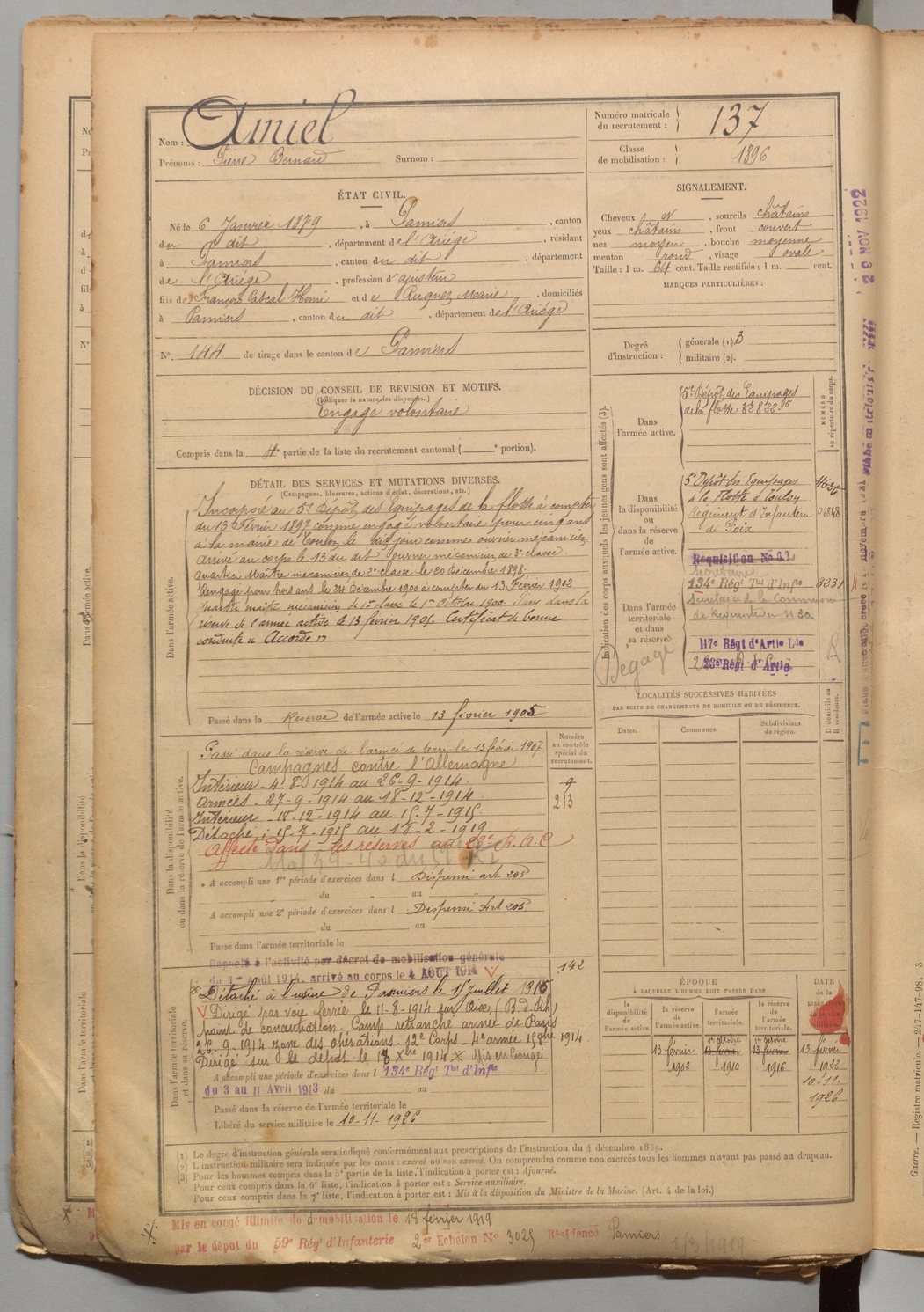 | Amiel | Pierre Bernard | FOIX | 1 R 456 | 1899 | Pamiers | Pamiers | 137 |