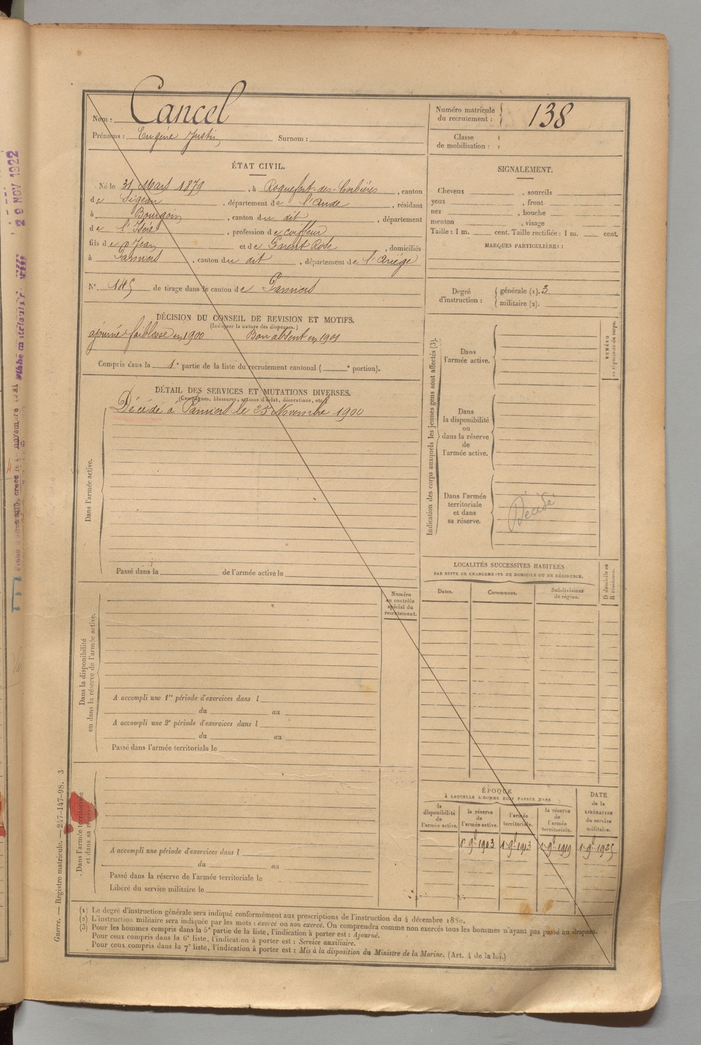 | Cancel | Eugène Justin | FOIX | 1 R 456 | 1899 | Roquefort des Corbières | Bourgoin | 138 |