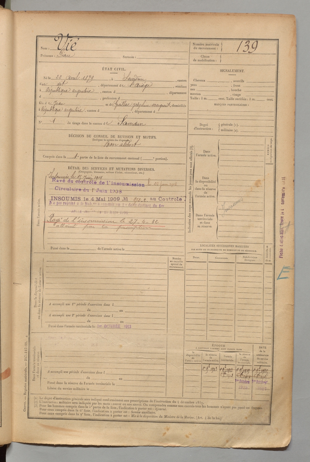 | Vié | Pierre | FOIX | 1 R 456 | 1899 | Saverdun | République Argentine | 139 |