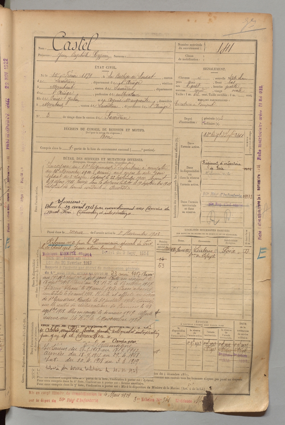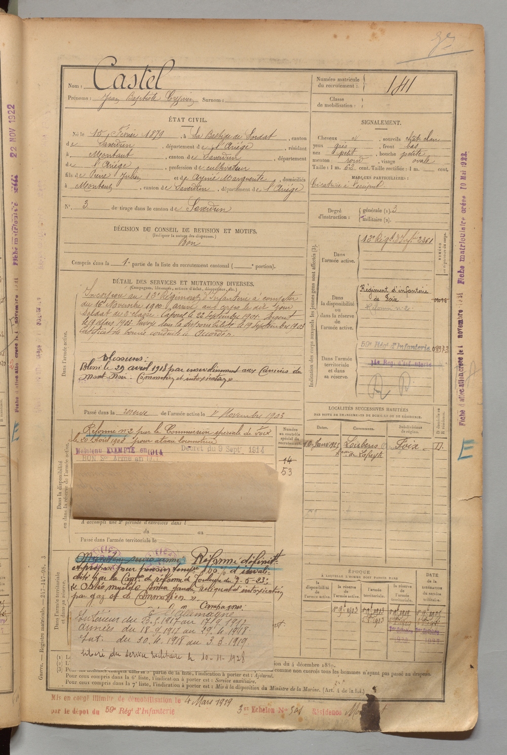 | Castel | Jean Baptiste Cyprien | FOIX | 1 R 456 | 1899 | Bastide-de-Lordat (La) | Montaut | 141 |