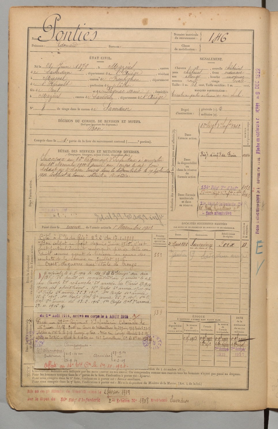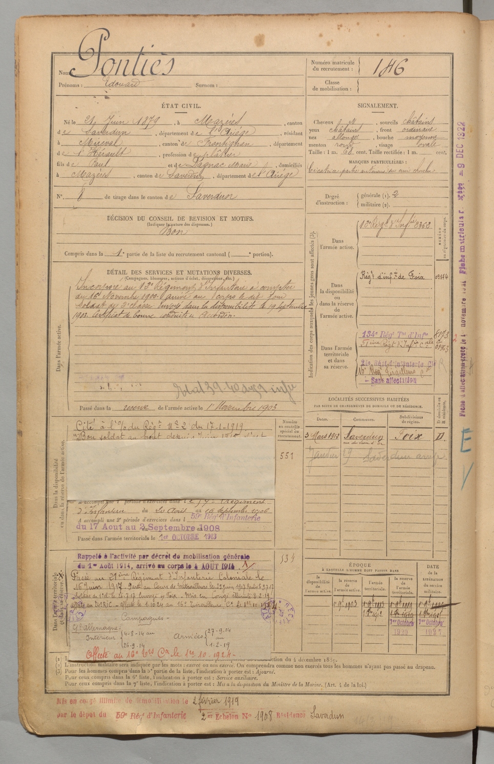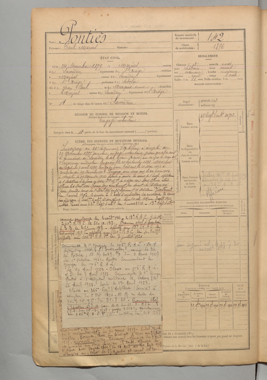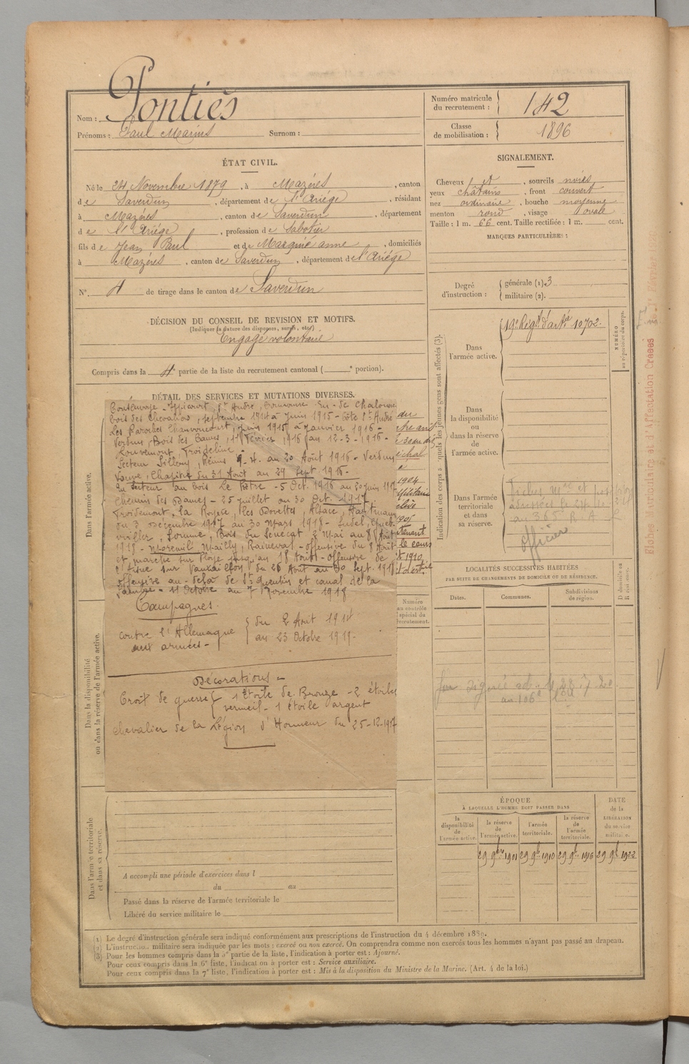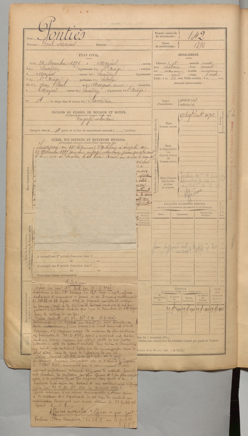 | Pontiès | Paul Marius | FOIX | 1 R 456 | 1899 | Mazères | Mazères | 142 |