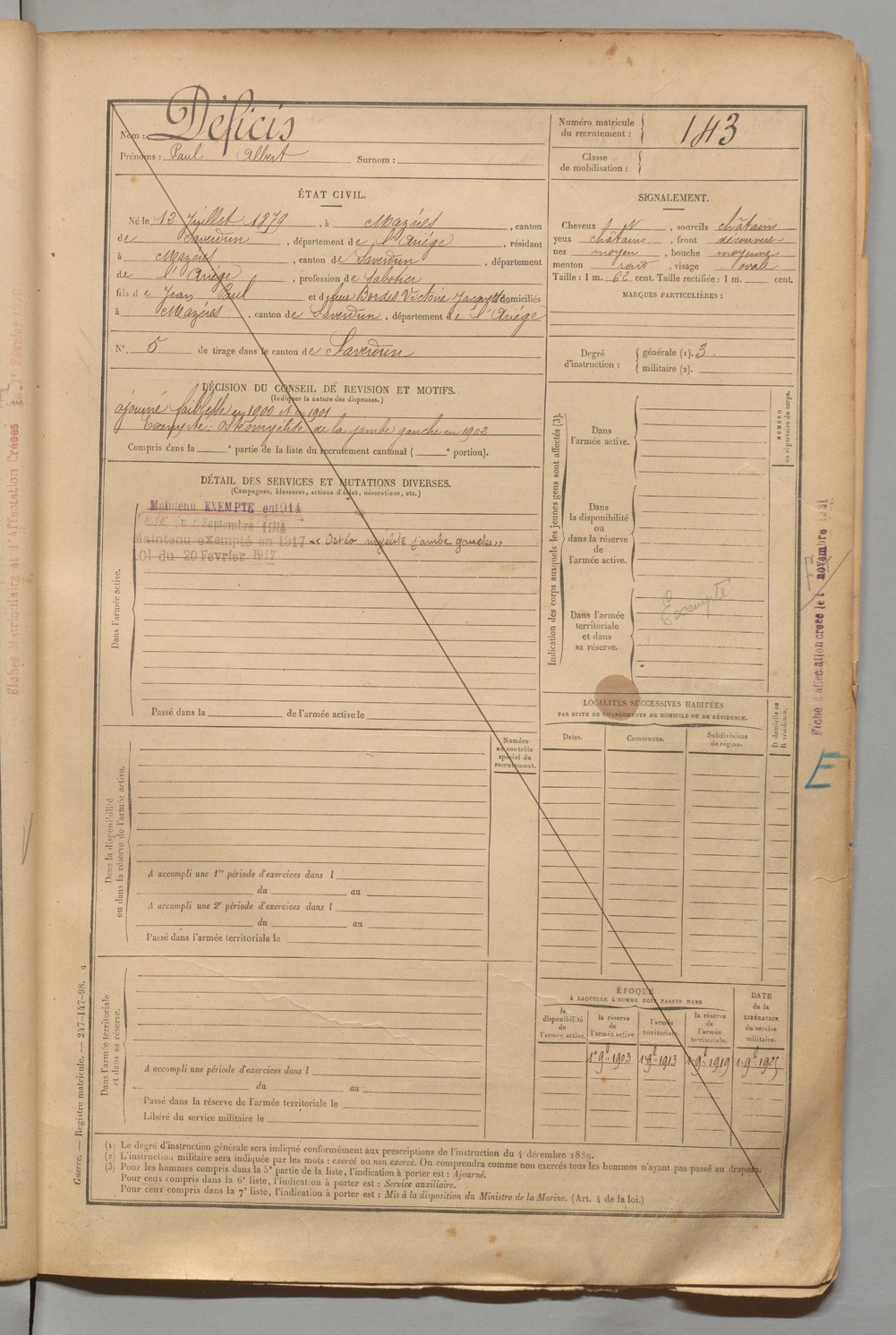 | Déficis | Paul Albert | FOIX | 1 R 456 | 1899 | Mazères | Mazères | 143 |