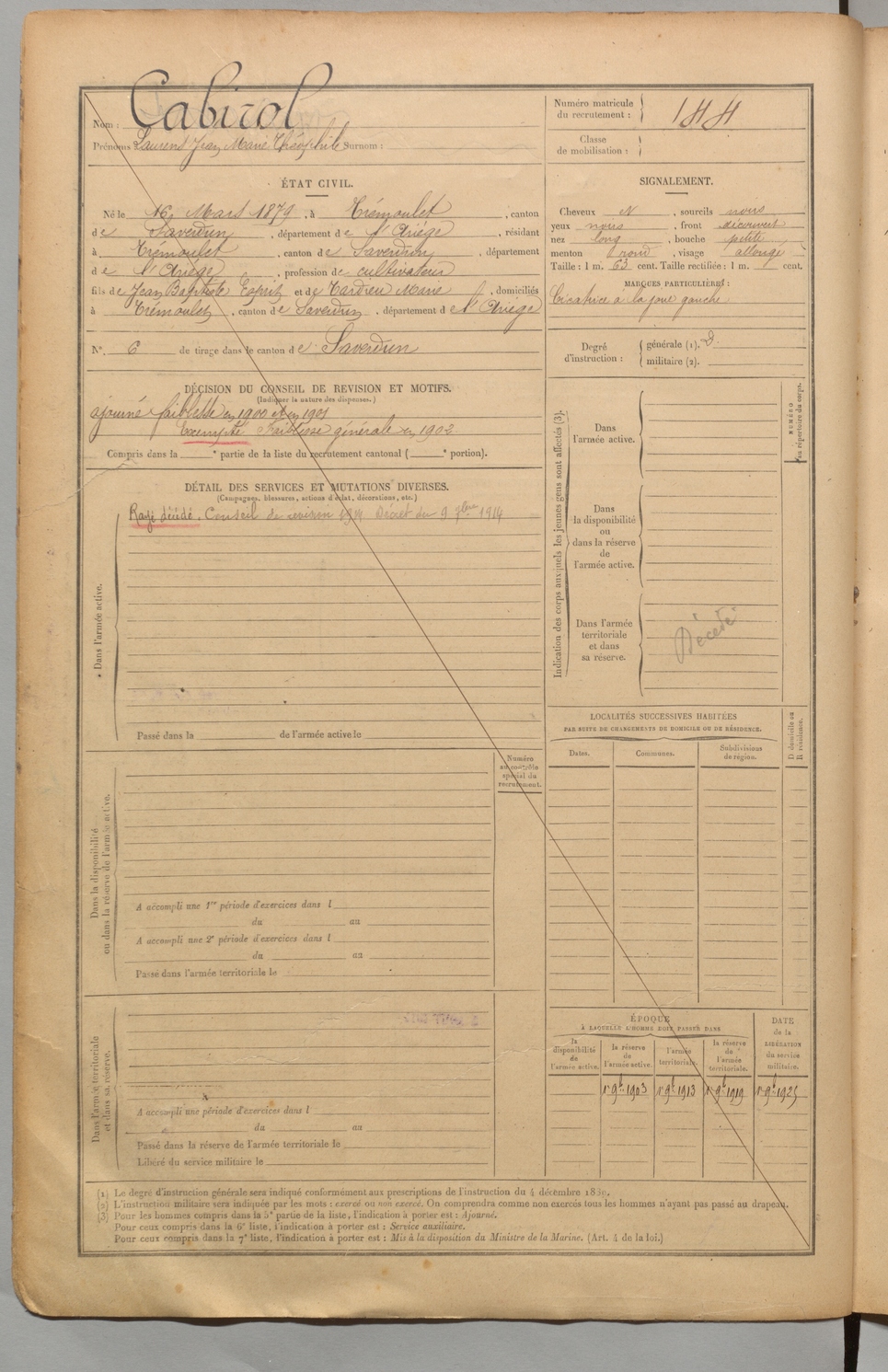 | Cabirol | Laurent Jean Marie Théophile | FOIX | 1 R 456 | 1899 | Trémoulet | Trémoulet | 144 |