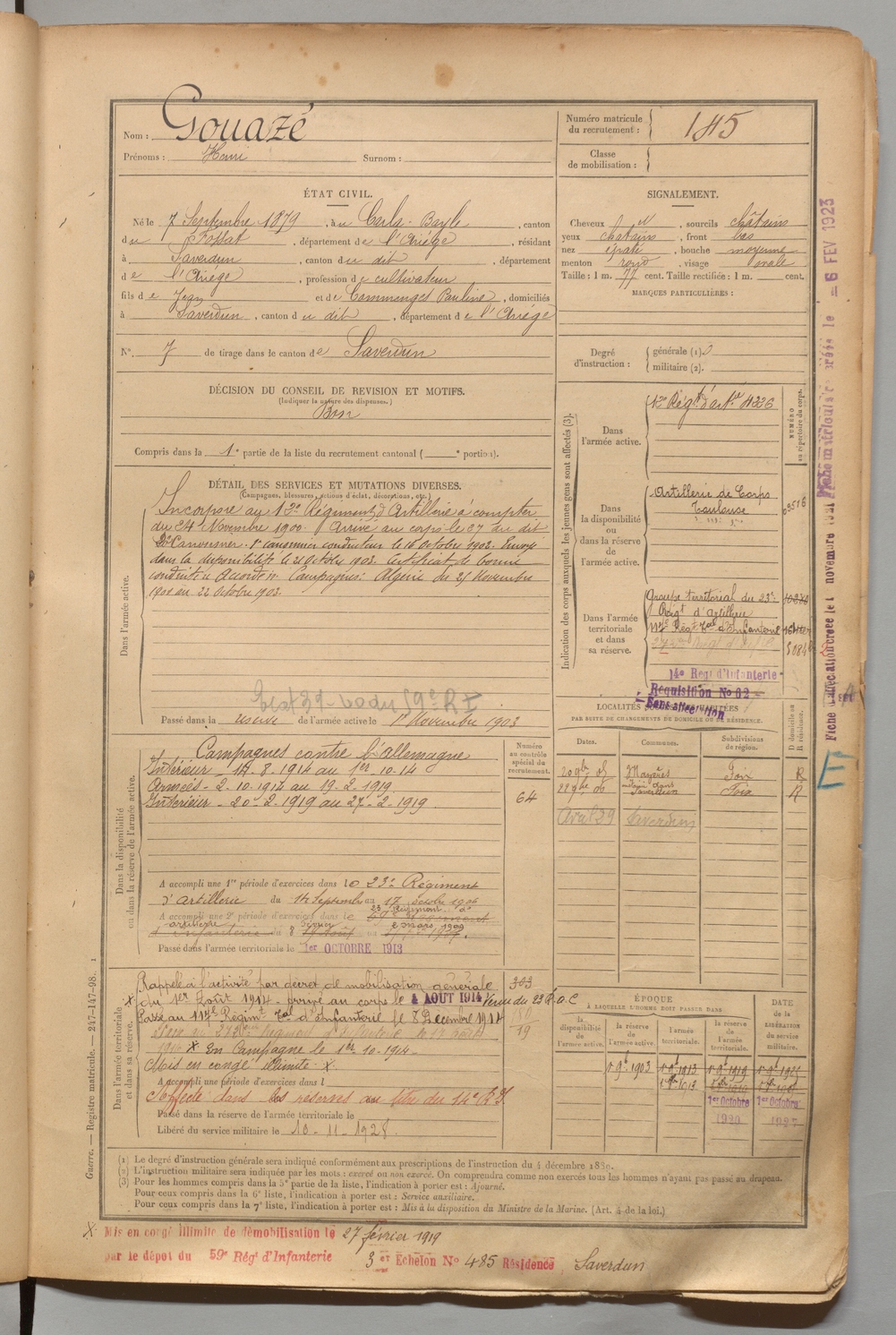 | Gouazé | Henri | FOIX | 1 R 456 | 1899 | Carla-Bayle (Le) | Saverdun | 145 |