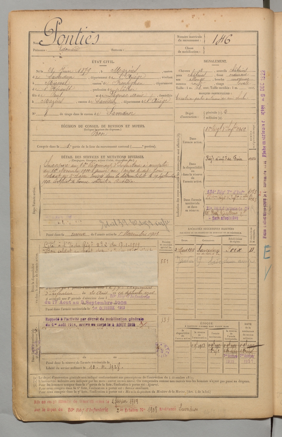 | Pontiès | Edouard | FOIX | 1 R 456 | 1899 | Mazères | Mireval | 146 |