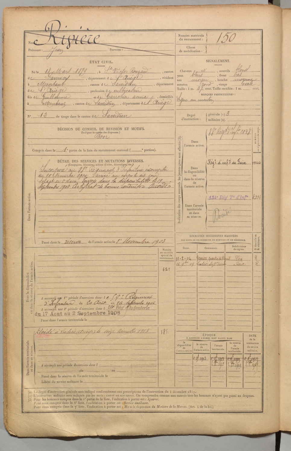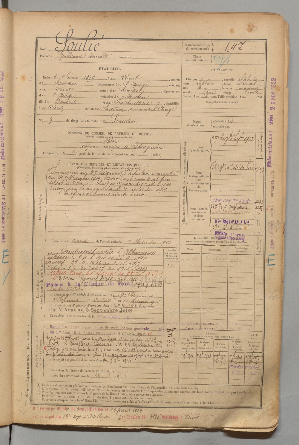 | Soulié | Guillaume Bernard | FOIX | 1 R 456 | 1899 | Vernet (Le) | Vernet (Le) | 147 |