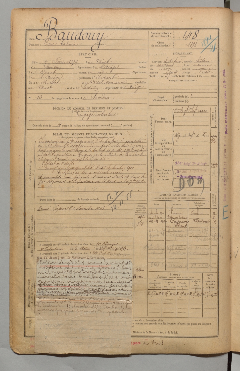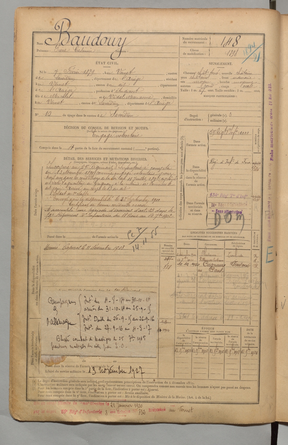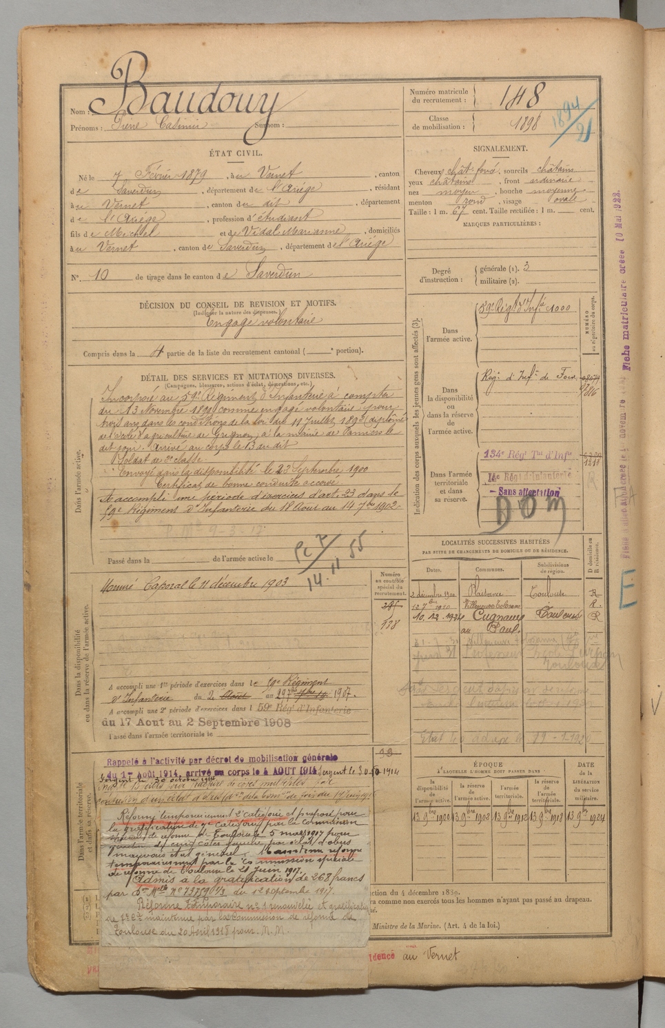 | Baudouy | Pierre Casimir | FOIX | 1 R 456 | 1899 | Vernet (Le) | Vernet (Le) | 148 |