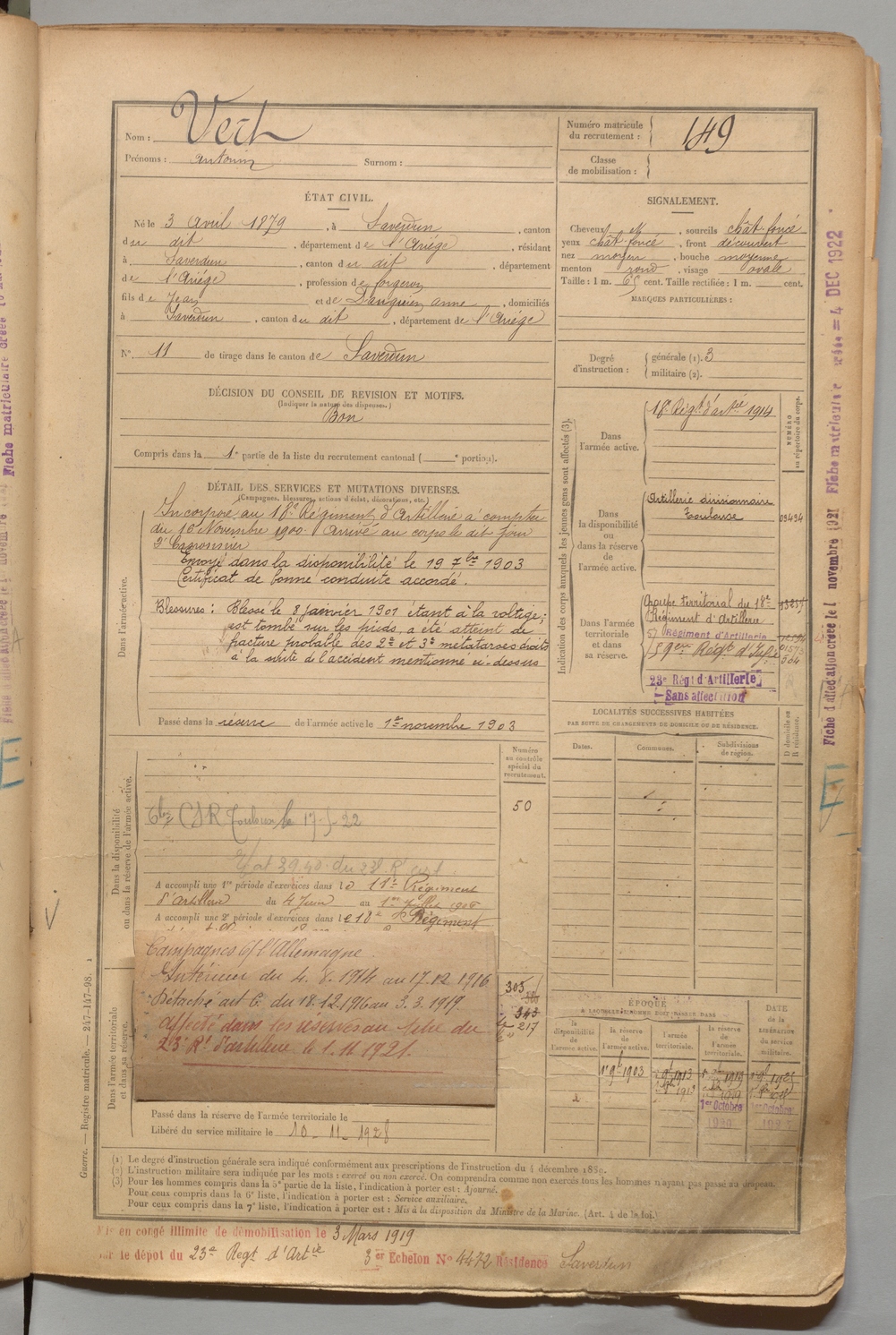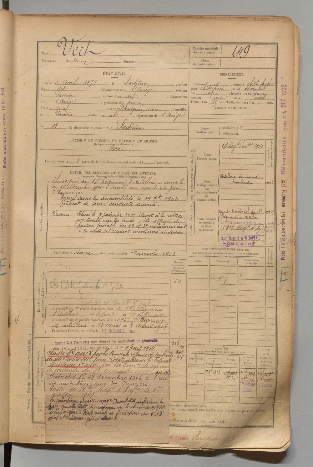 | Vert | Antonin | FOIX | 1 R 456 | 1899 | Saverdun | Saverdun | 149 |