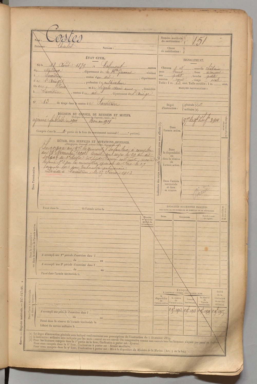 | Costes | Charles | FOIX | 1 R 456 | 1899 | Calmont | Saverdun | 151 |