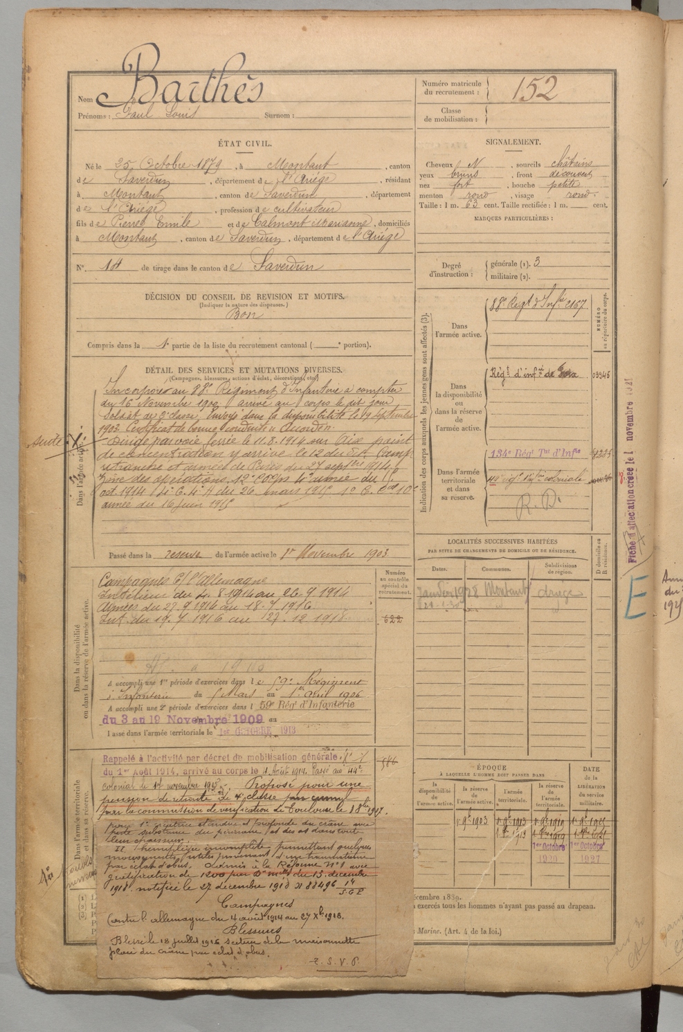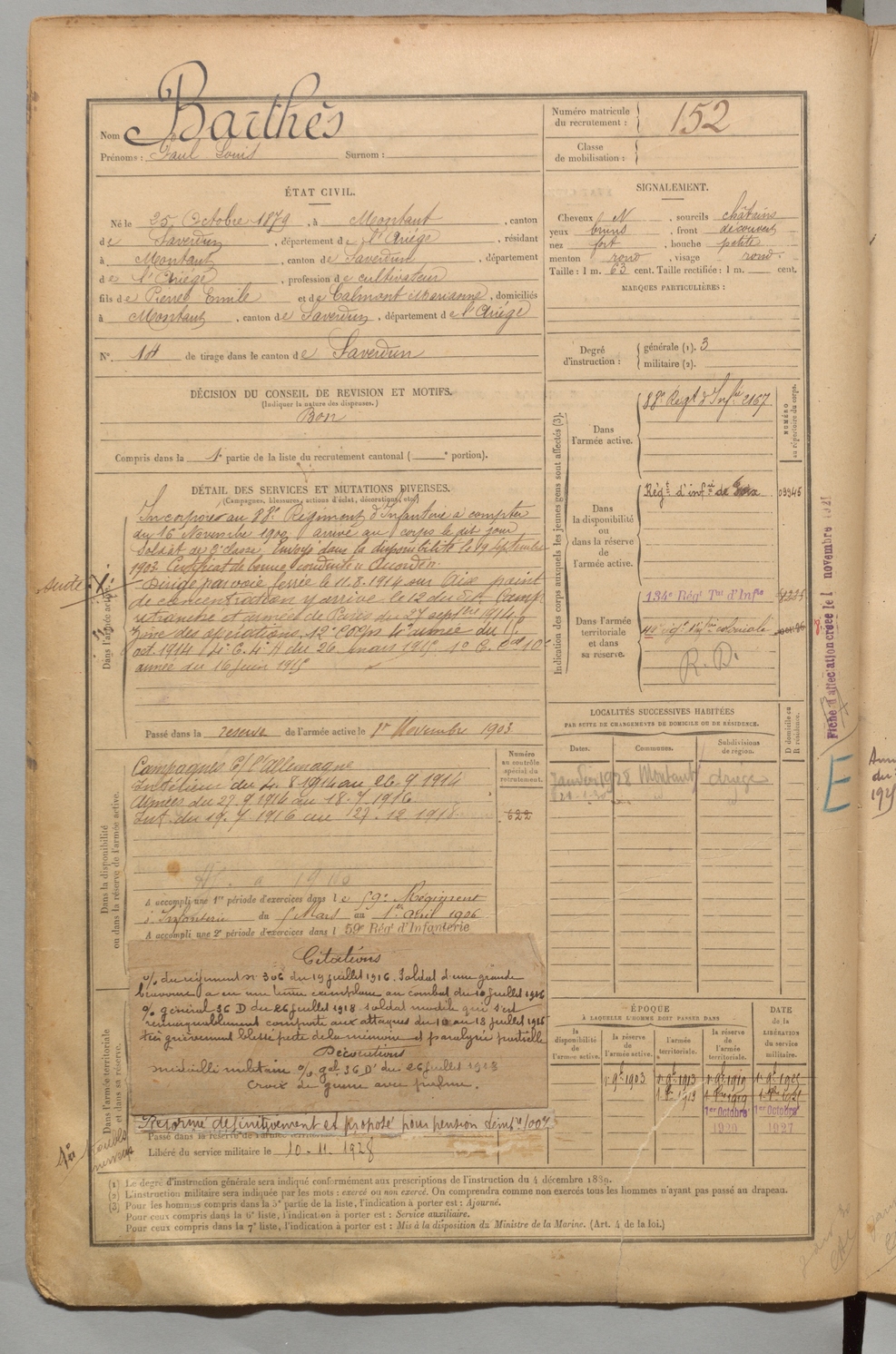 | Barthès | Paul Louis | FOIX | 1 R 456 | 1899 | Montaut | Montaut | 152 |