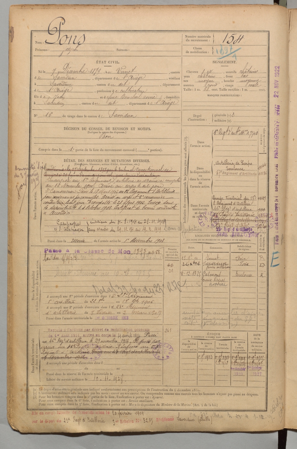 | Pons | Joseph | FOIX | 1 R 456 | 1899 | Vernet (Le) | Saverdun | 154 |