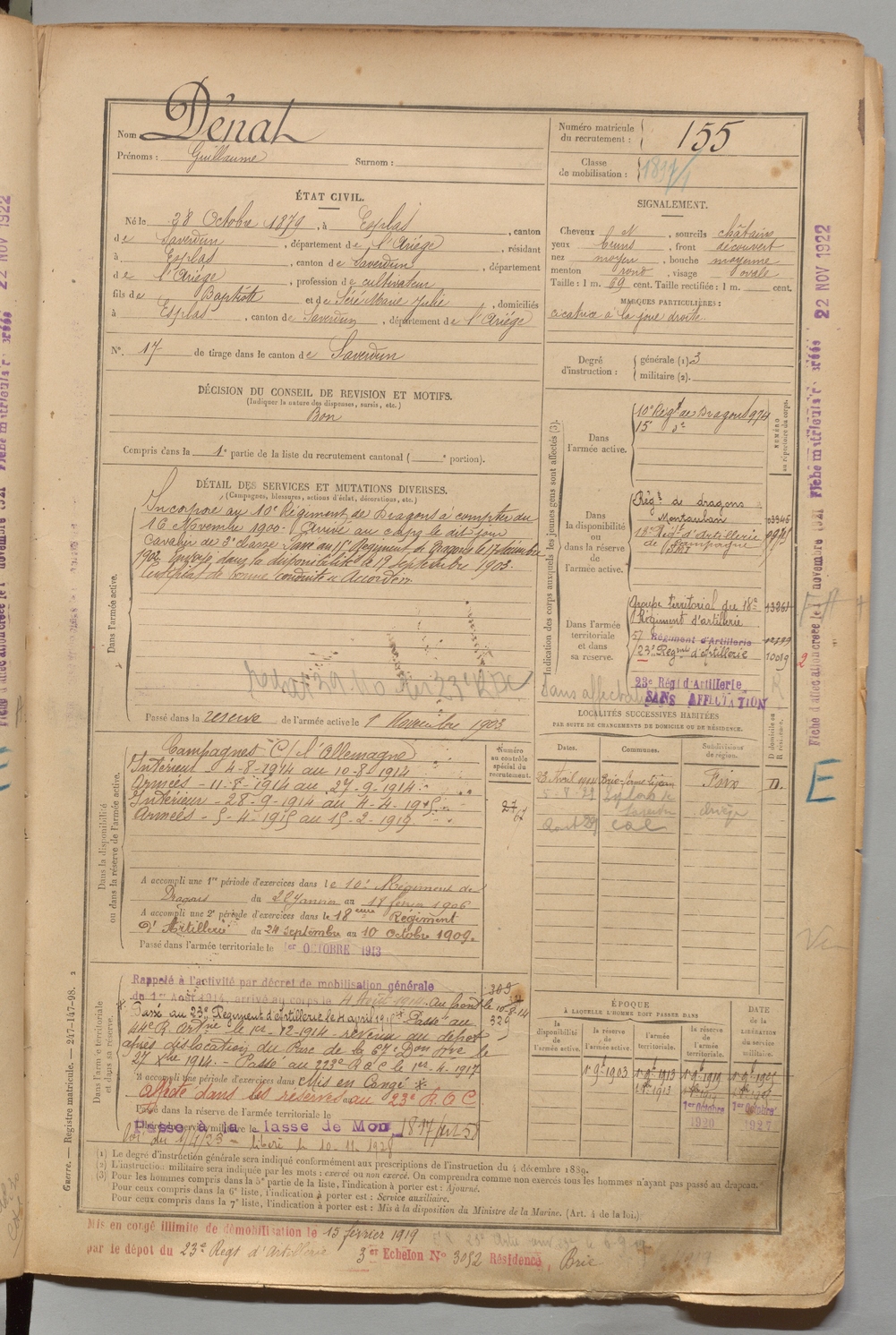 | Dénat | Guillaume | FOIX | 1 R 456 | 1899 | Esplas-de-Saverdun | Esplas-de-Saverdun | 155 |