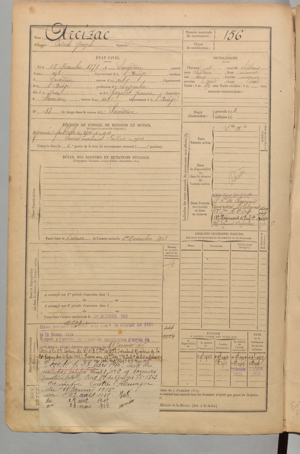 | Arcizac | Pascal Joseph | FOIX | 1 R 456 | 1899 | Saverdun | Saverdun | 156 |
