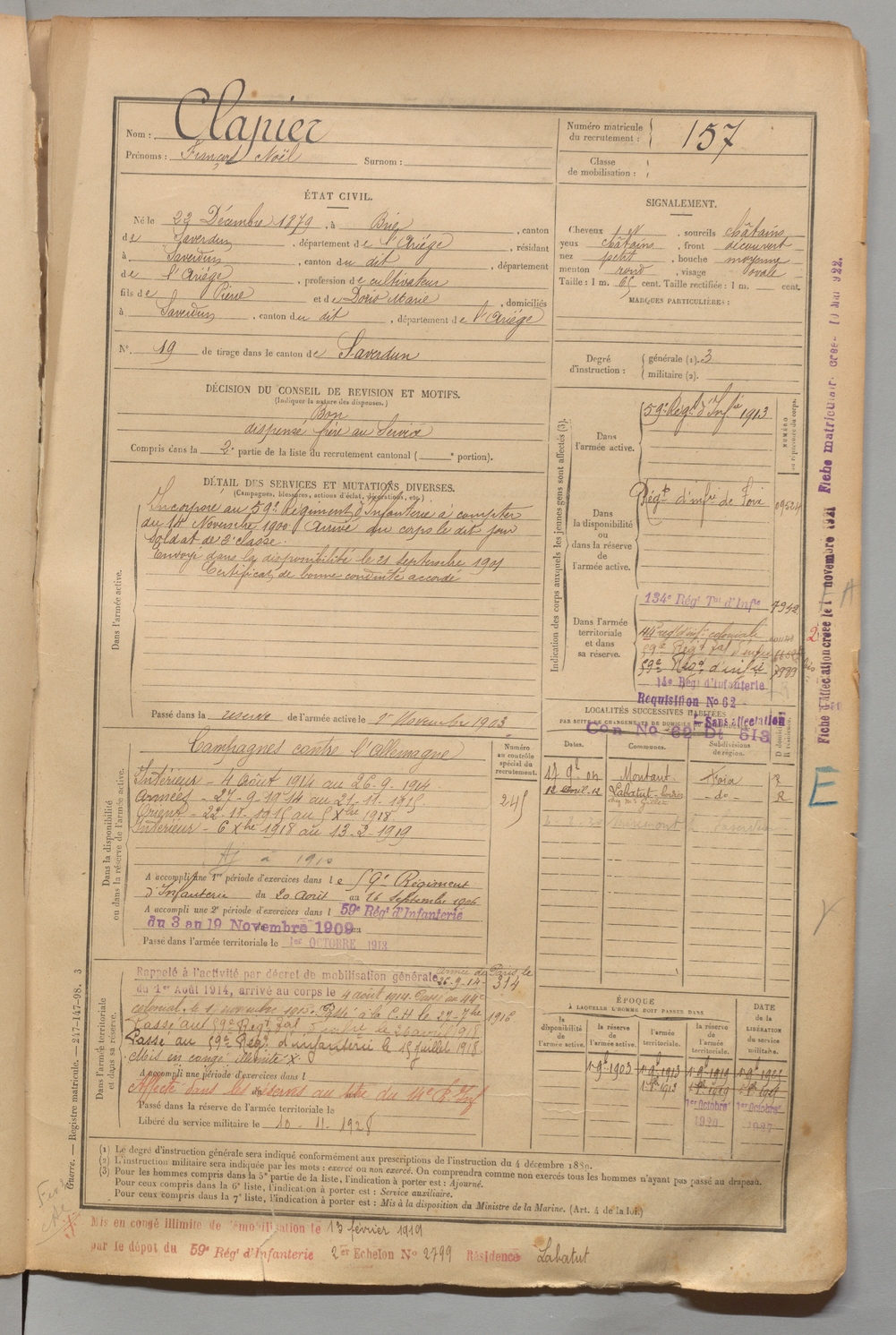 | Clapier | François Noël | FOIX | 1 R 456 | 1899 | Brie | Saverdun | 157 |