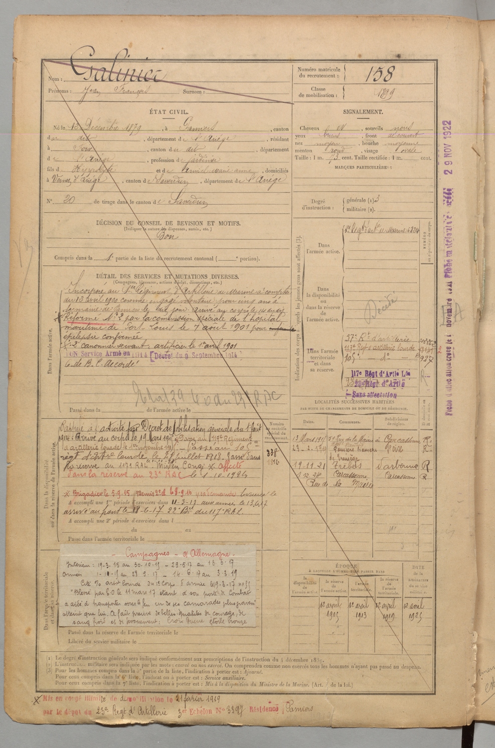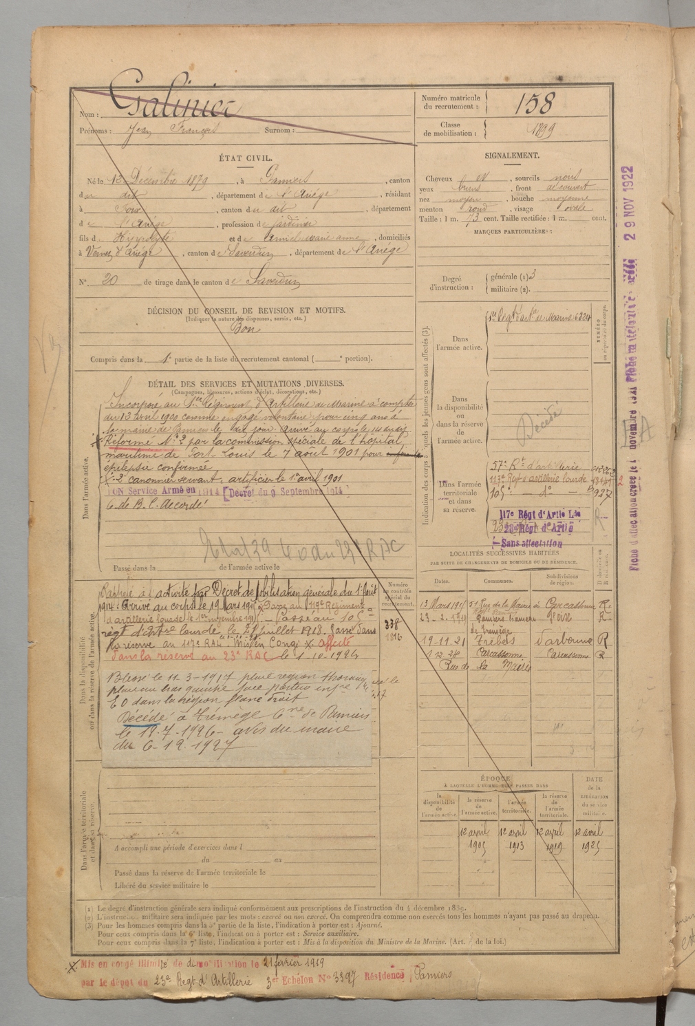 | Galinier | Jean François | FOIX | 1 R 456 | 1899 | Pamiers | Foix | 158 |