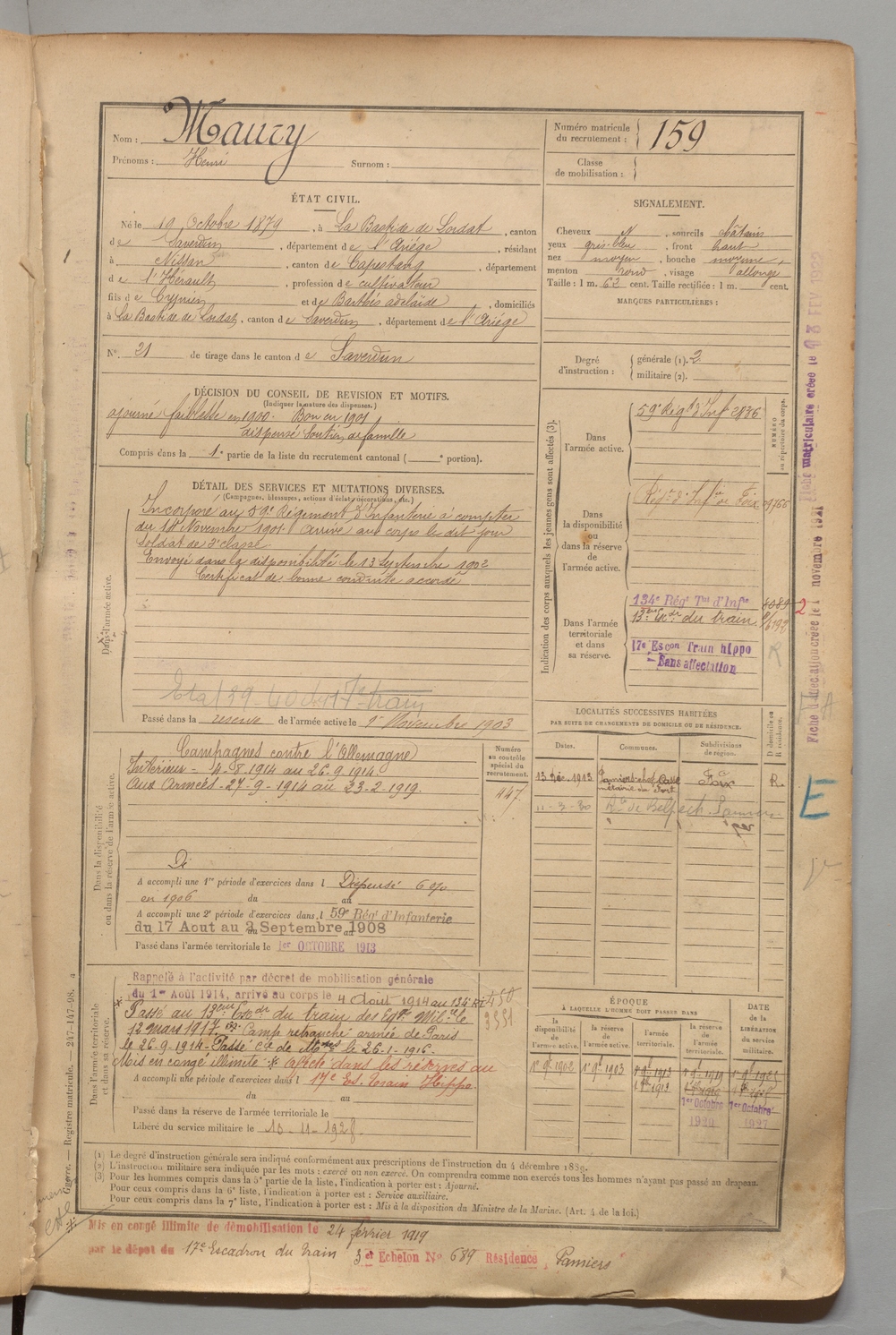 | Maury | Henri | FOIX | 1 R 456 | 1899 | Bastide-de-Lordat (La) | Nissan | 159 |