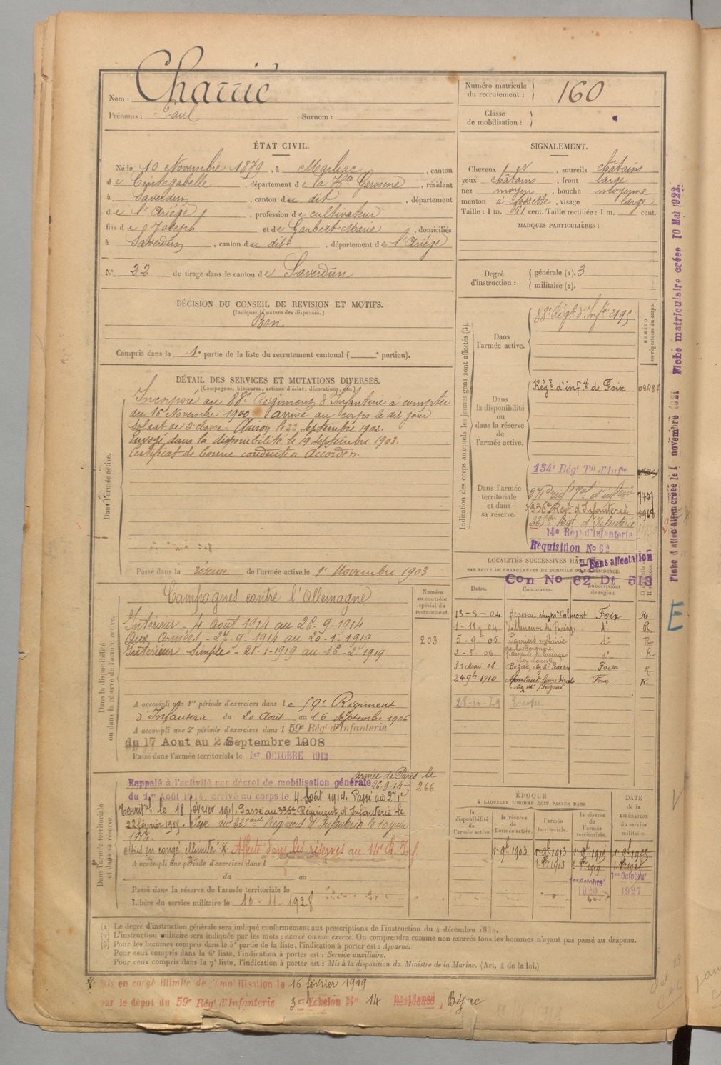 | Charrié | Paul | FOIX | 1 R 456 | 1899 | Marliac | Saverdun | 160 |