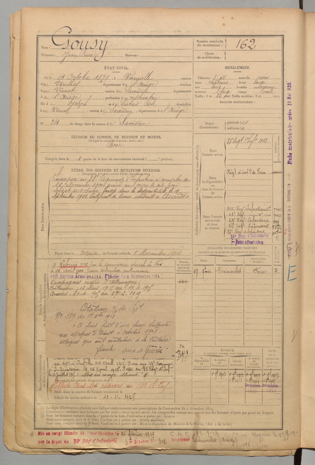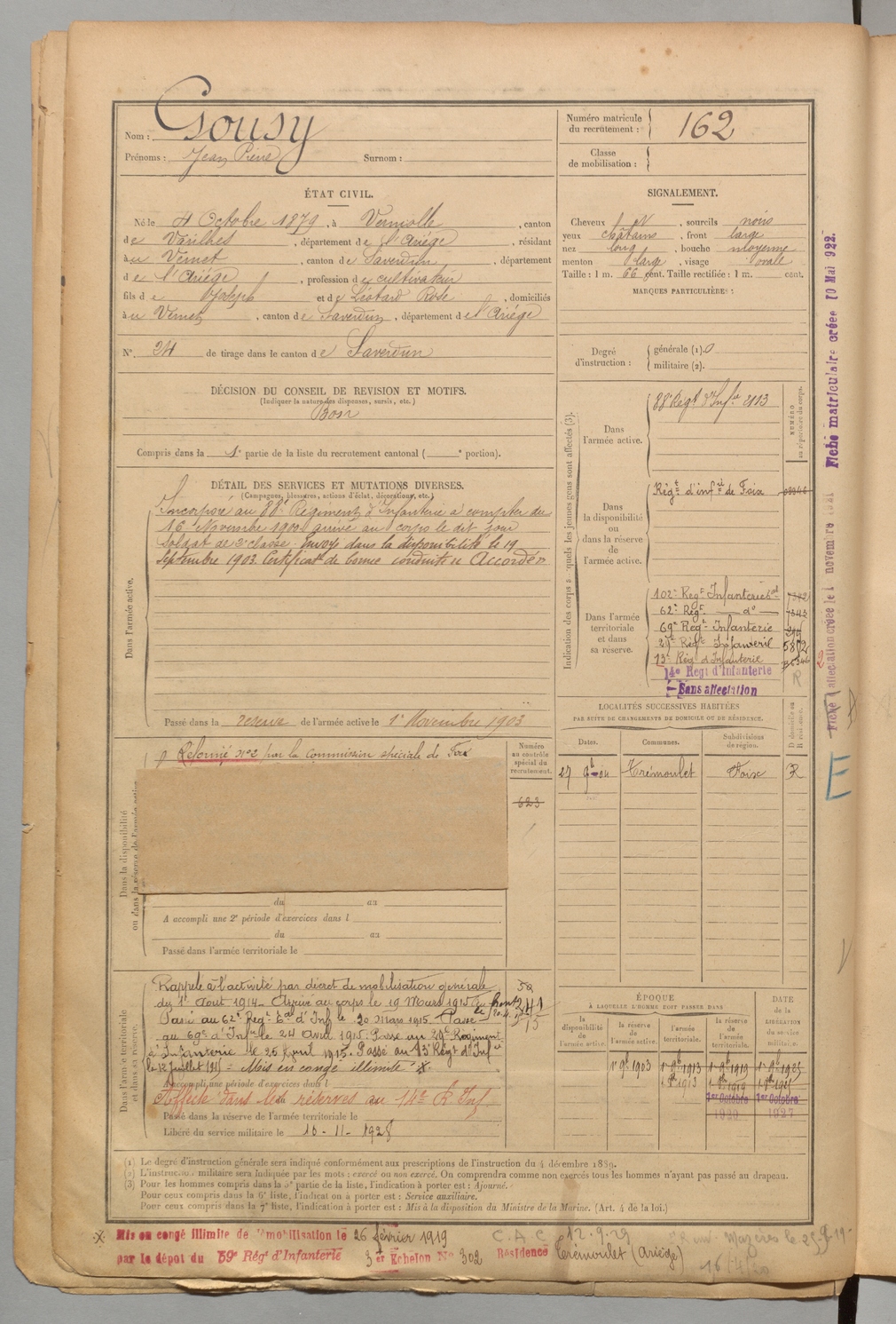 | Gousy | Jean Pierre | FOIX | 1 R 456 | 1899 | Verniolle | Vernet (Le) | 162 |