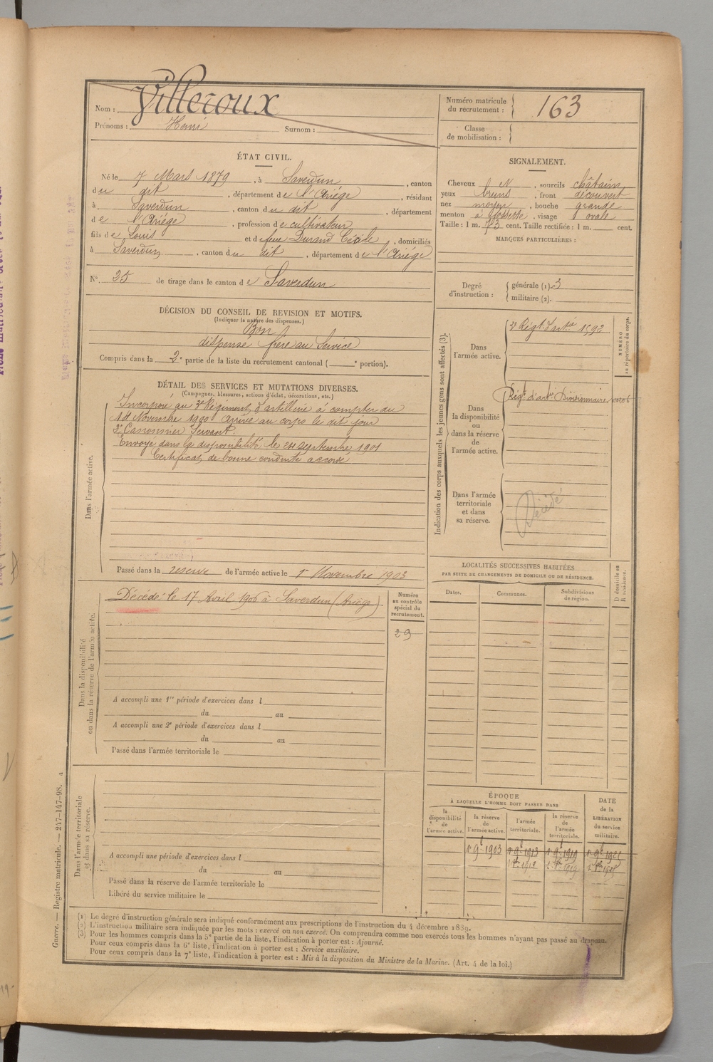 | Villeroux | Henri | FOIX | 1 R 456 | 1899 | Saverdun | Saverdun | 163 |