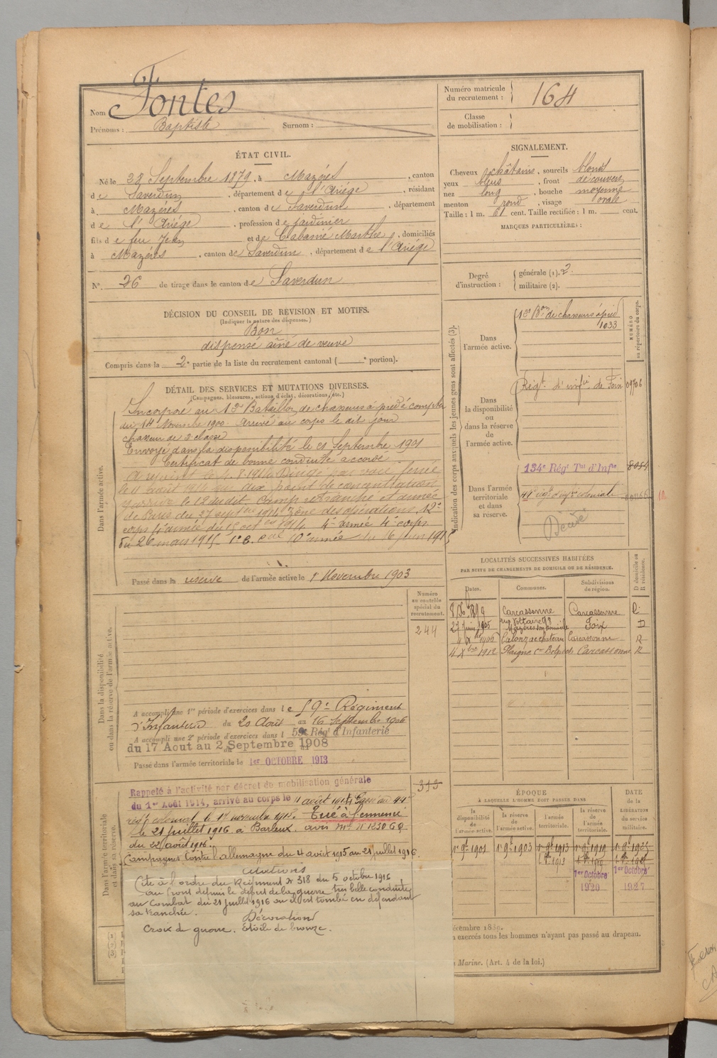 | Fontes | Baptiste | FOIX | 1 R 456 | 1899 | Mazères | Mazères | 164 |