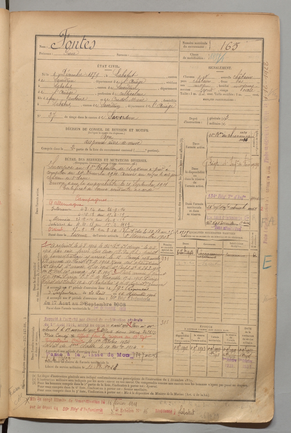 | Fontes | Pierre | FOIX | 1 R 456 | 1899 | Labatut | Labatut | 165 |
