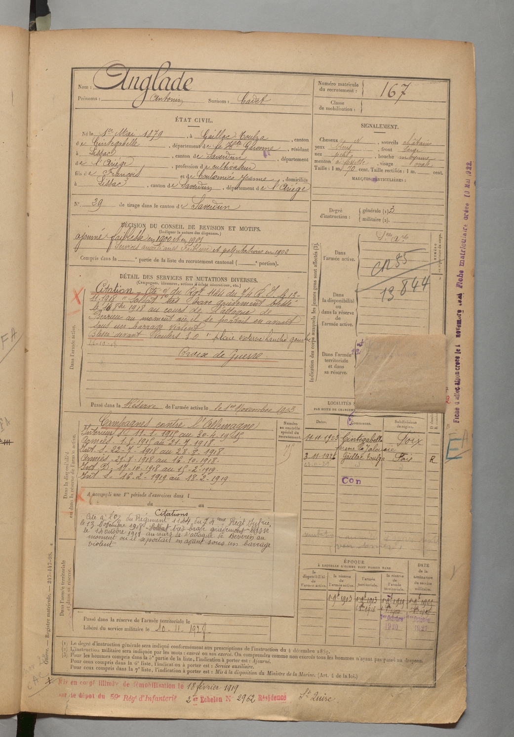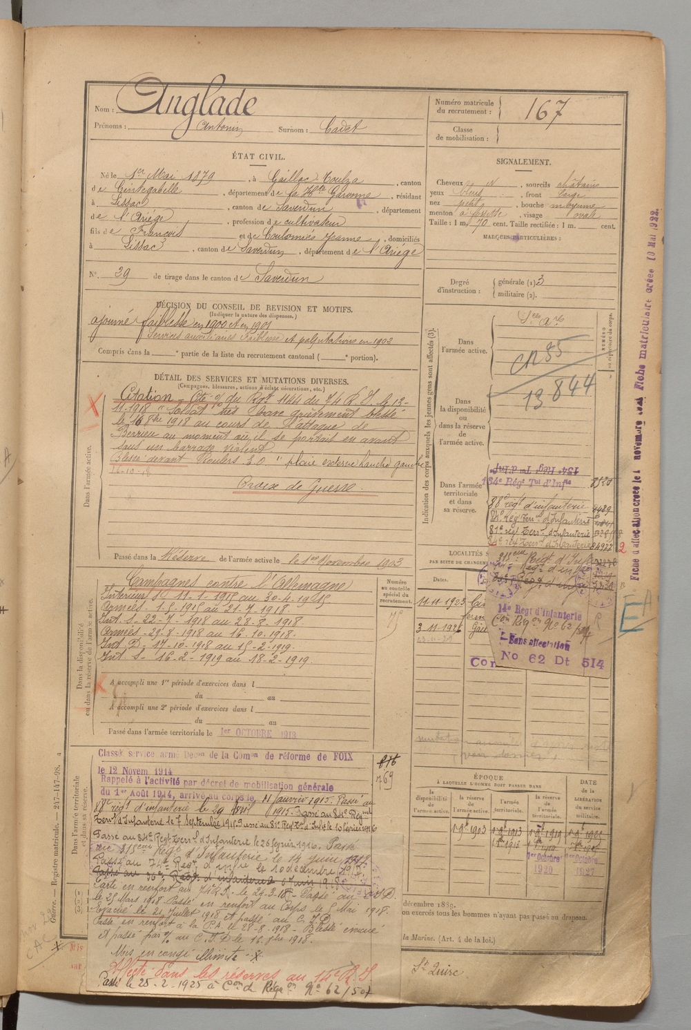 | Anglade | Antonin dit Cadet | FOIX | 1 R 456 | 1899 | Gaillac-Toulza | Lissac | 167 |