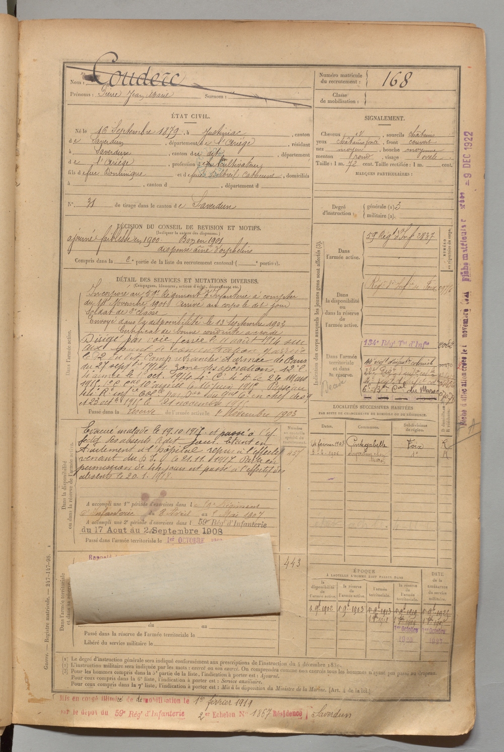 | Couderc | Pierre Jean Marie | FOIX | 1 R 456 | 1899 | Justiniac | Saverdun | 168 |