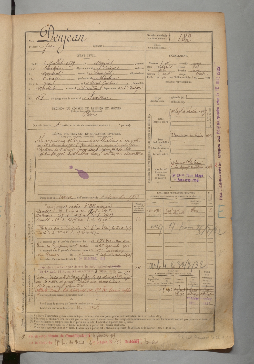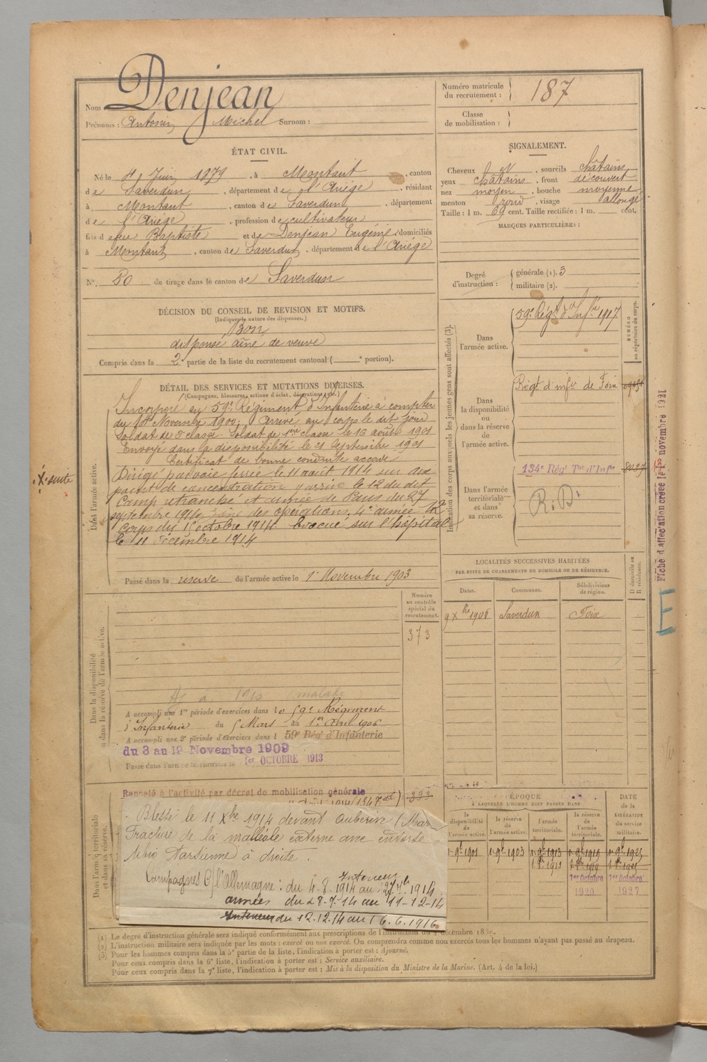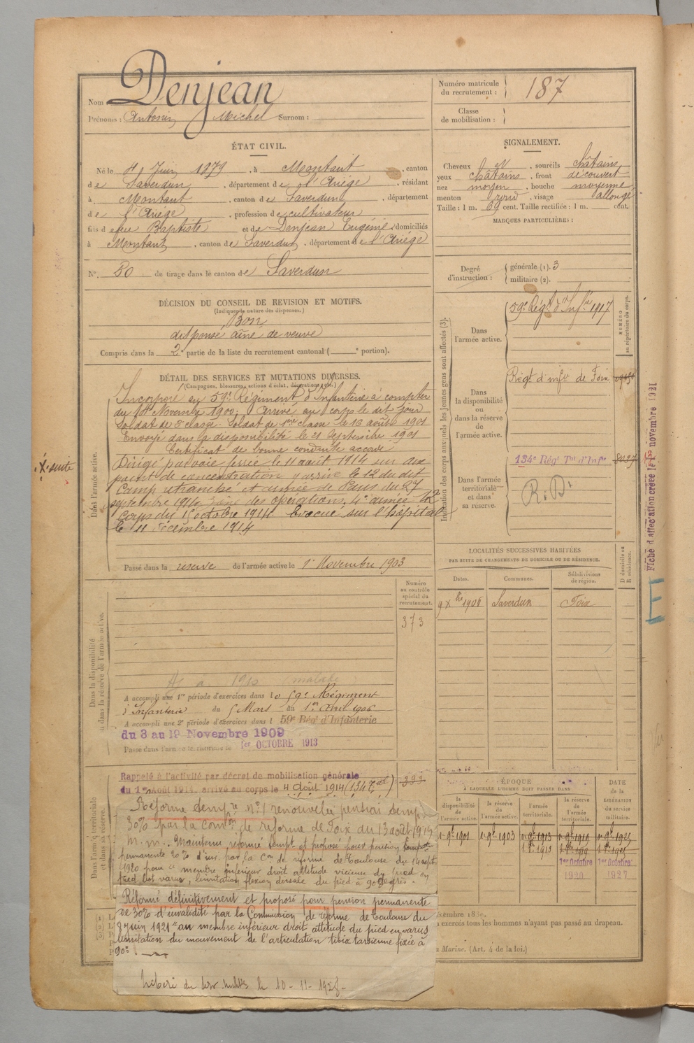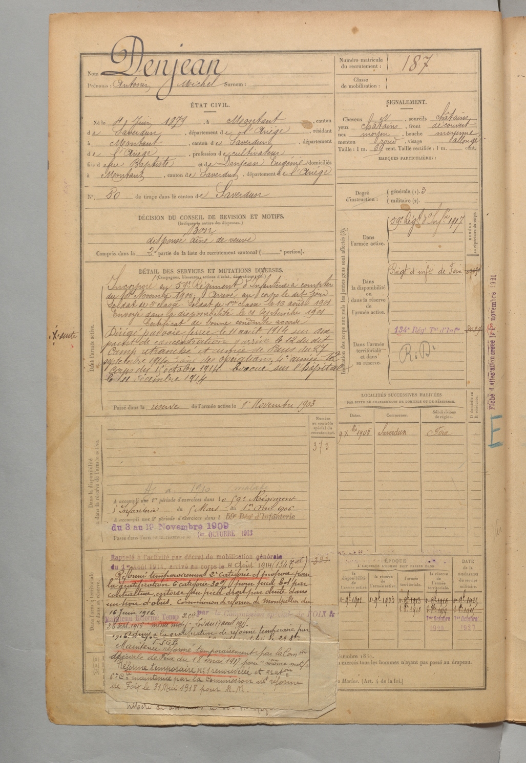 | Denjean | Antonin Michel | FOIX | 1 R 456 | 1899 | Montaut | Montaut | 187 |