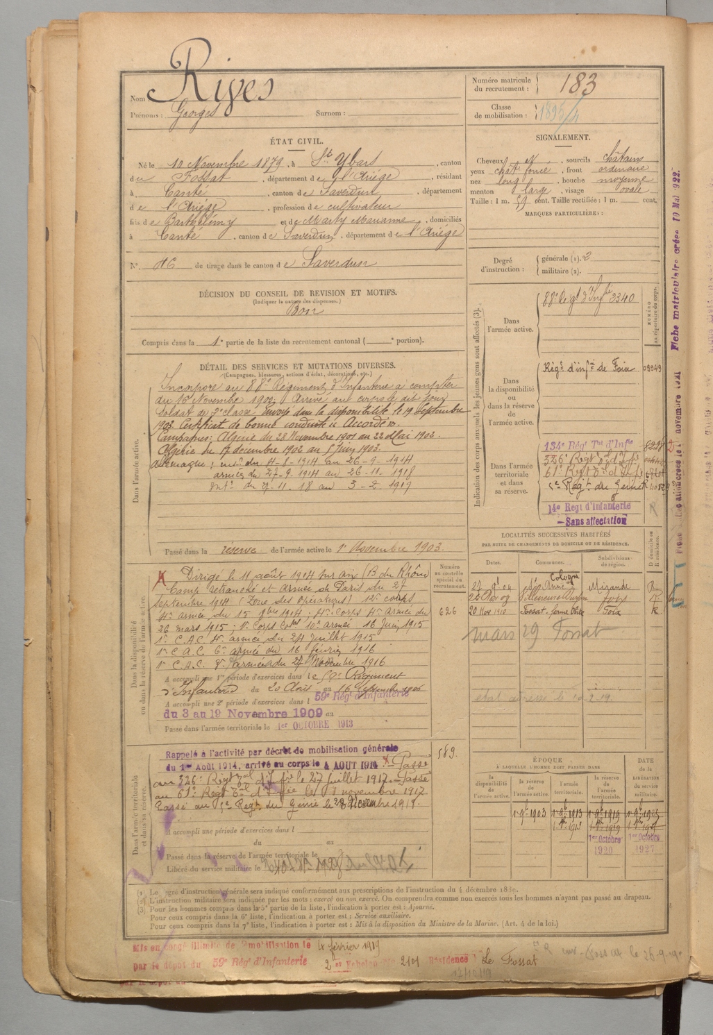 | Rives | Georges | FOIX | 1 R 456 | 1899 | Saint-Ybars | Canté | 183 |