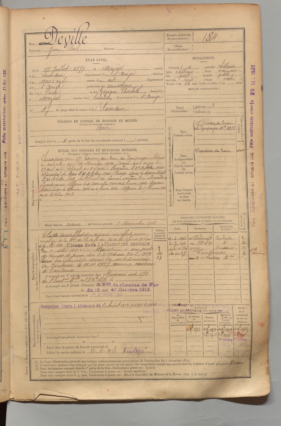 | Deville | Jean Paul | FOIX | 1 R 456 | 1899 | Mazères | Mas-d'Azil (Le) | 184 |