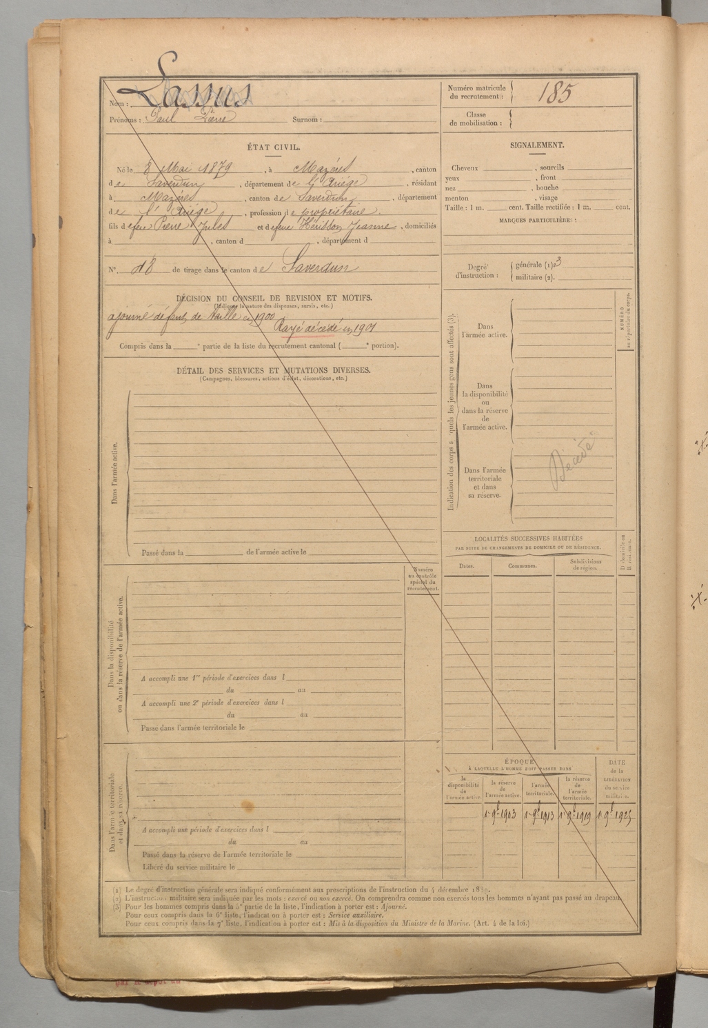 | Lassus | Paul Pierre | FOIX | 1 R 456 | 1899 | Mazères | Mazères | 185 |