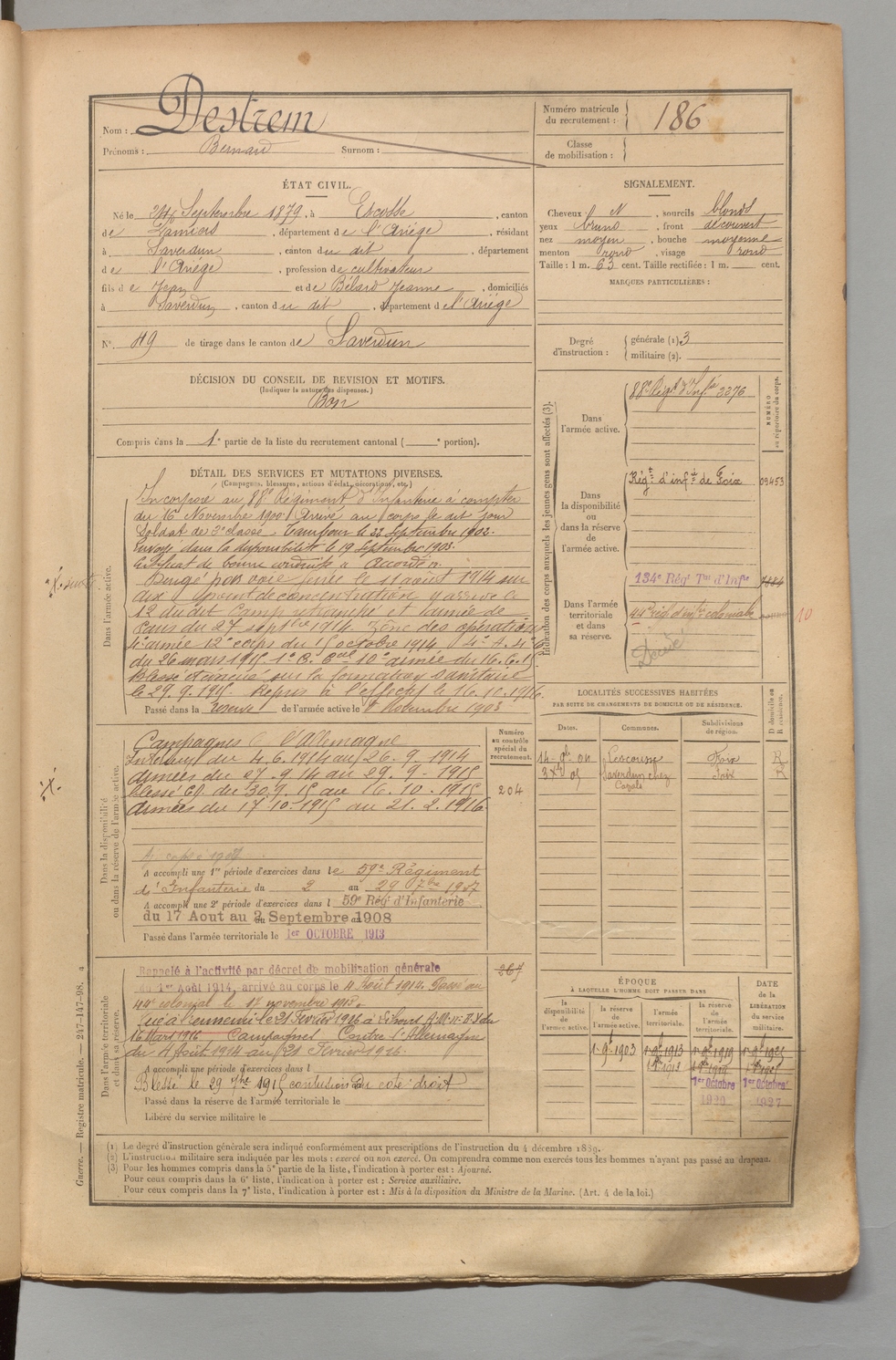 | Destrem | Bernard | FOIX | 1 R 456 | 1899 | Escosse | Saverdun | 186 |