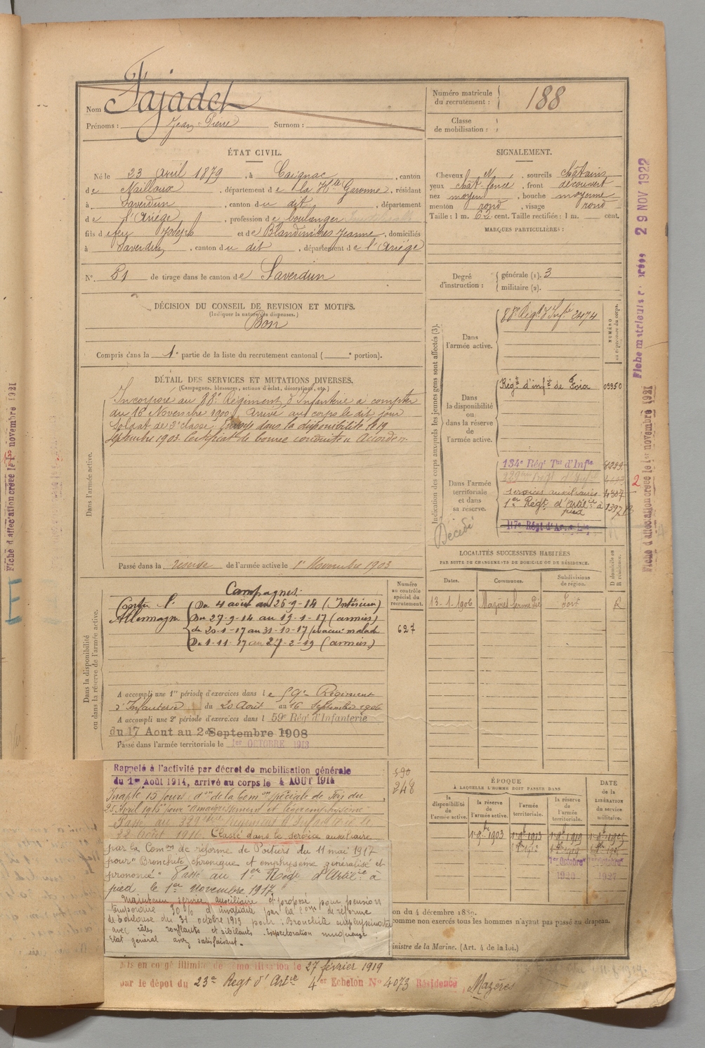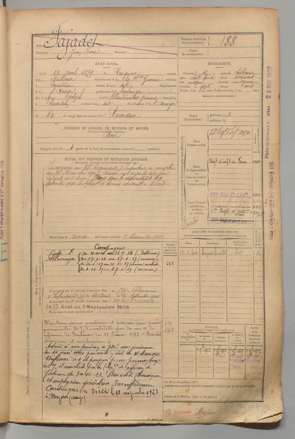 | Fajadet | Jean Pierre | FOIX | 1 R 456 | 1899 | Caignac | Saverdun | 188 |