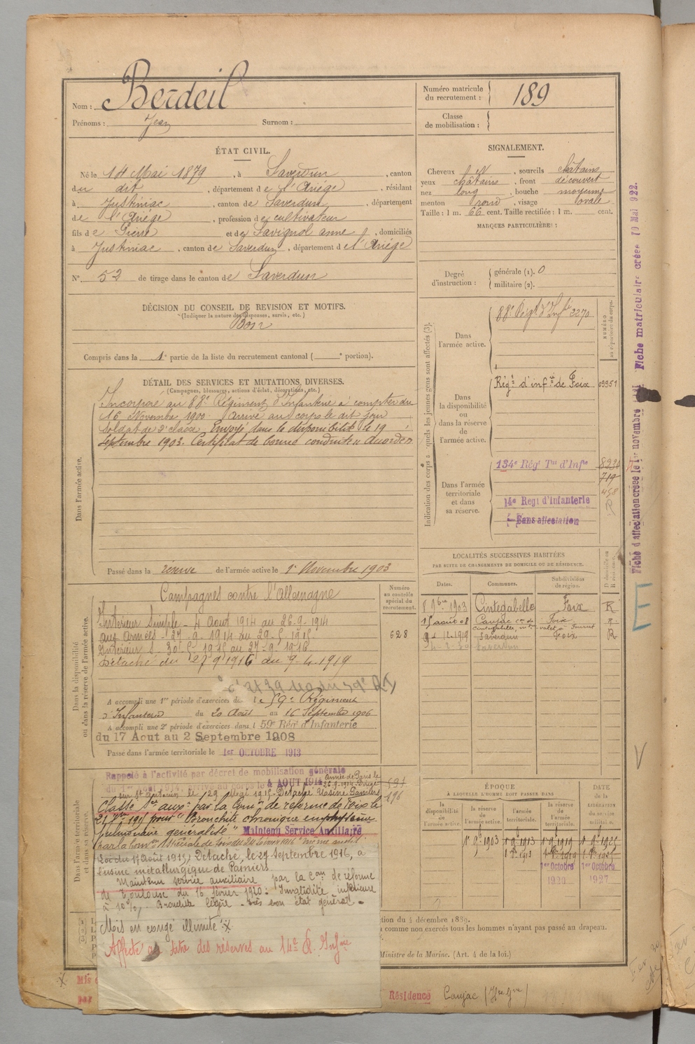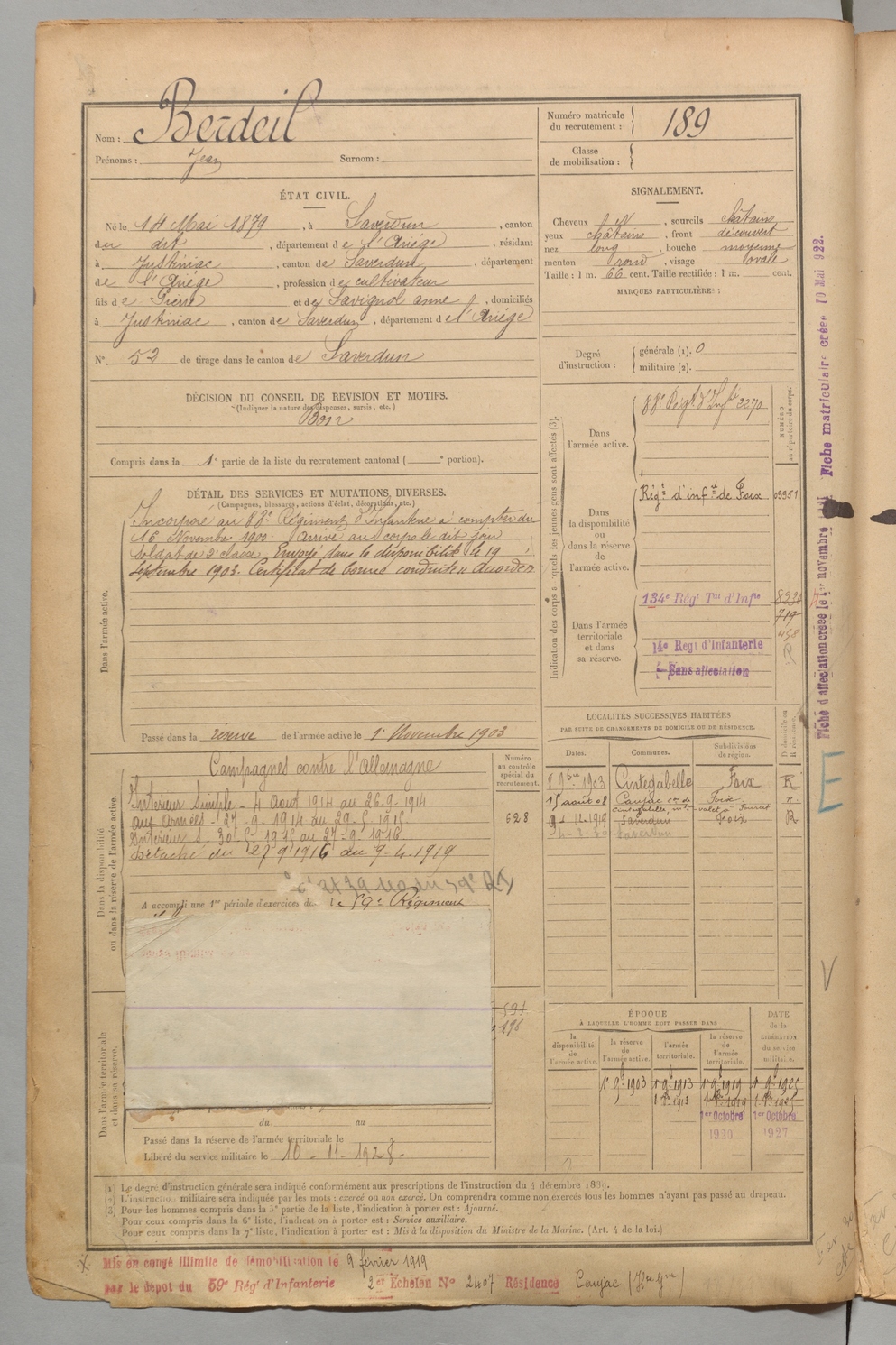 | Berdeil | Jean | FOIX | 1 R 456 | 1899 | Saverdun | Justiniac | 189 |