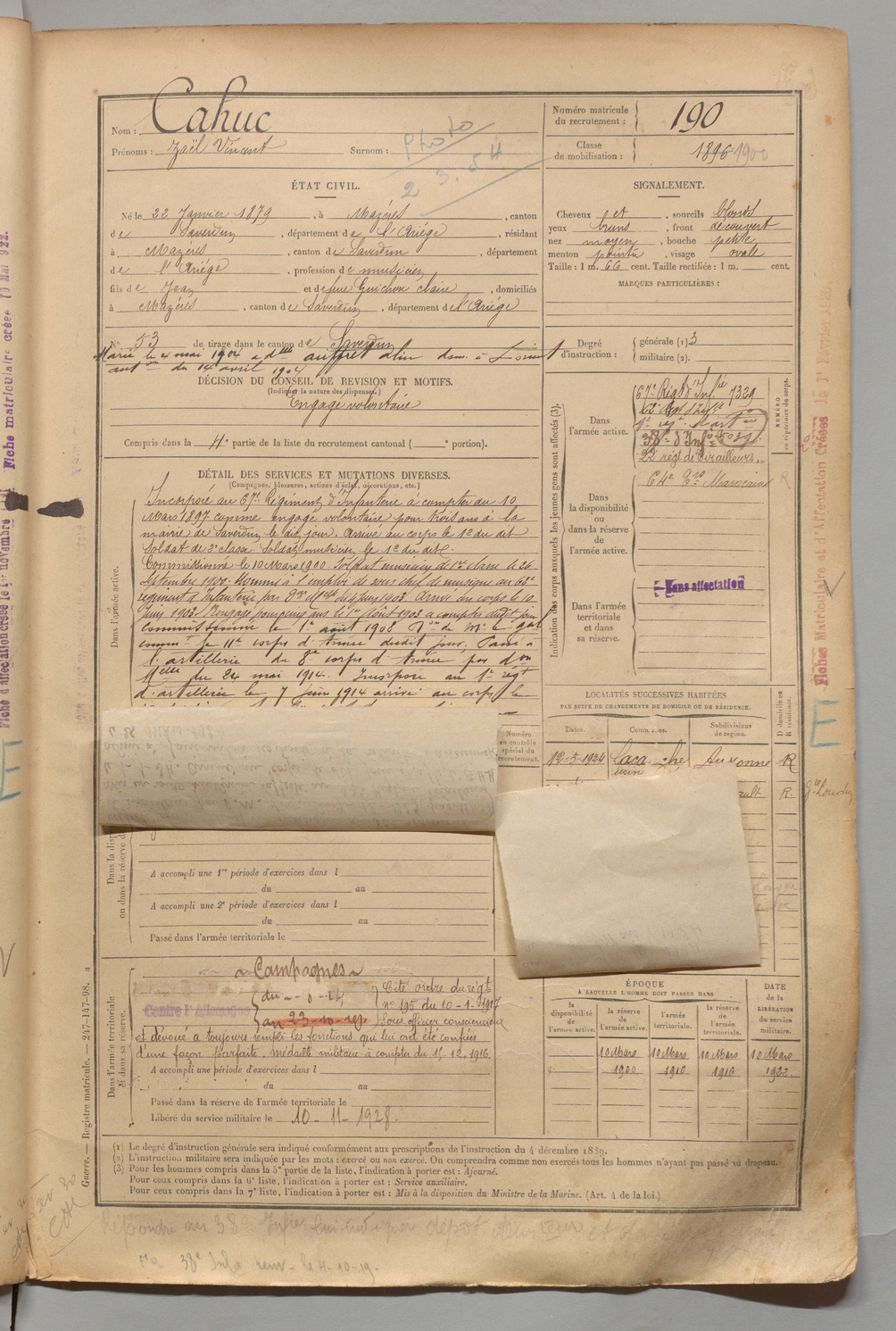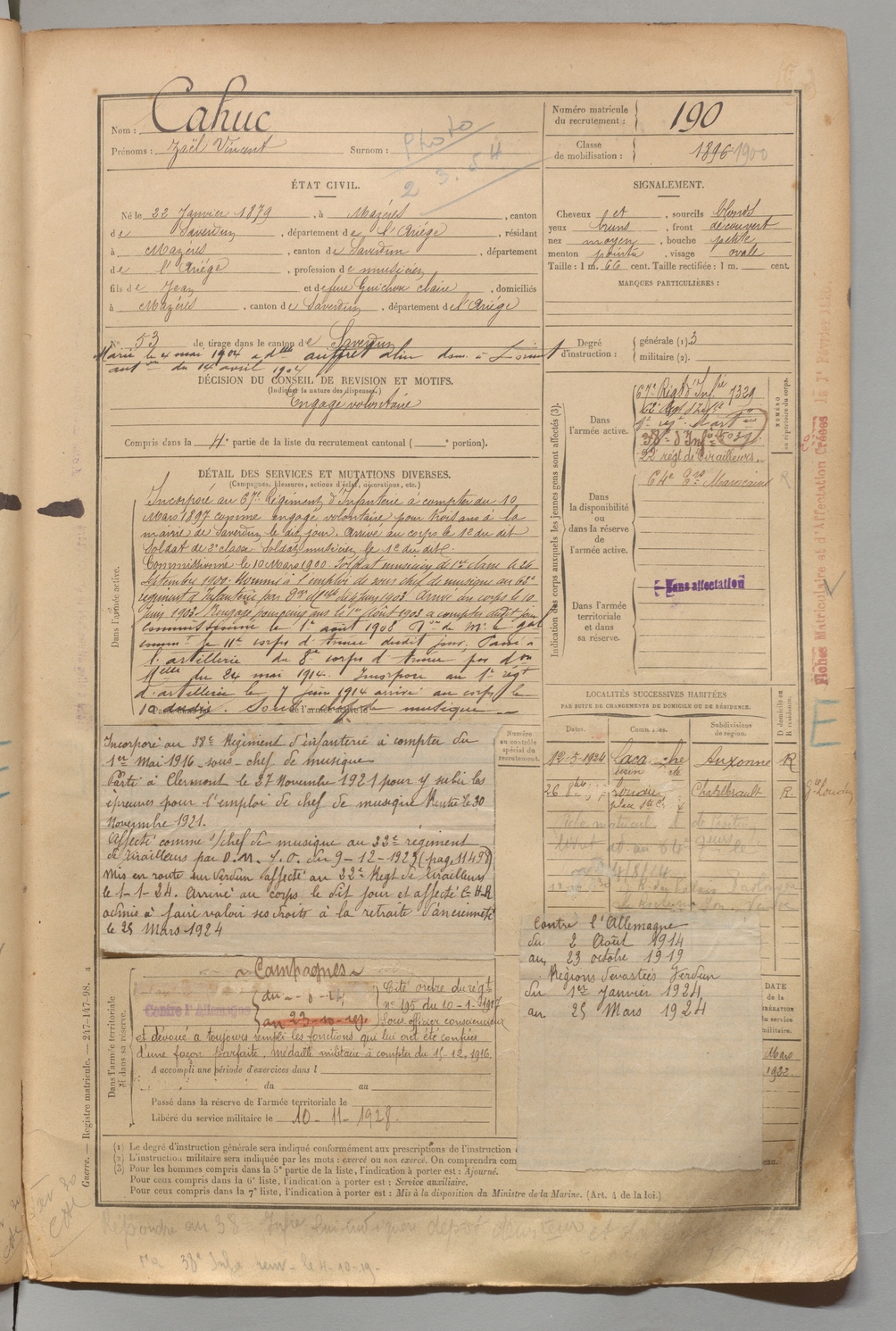 | Cahuc | Zaël Vincent | FOIX | 1 R 456 | 1899 | Mazères | Mazères | 190 |