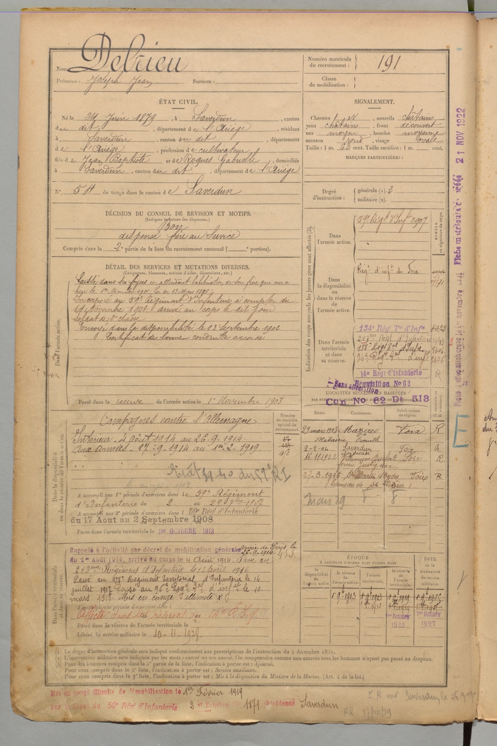 | Delrieu | Joseph Jean | FOIX | 1 R 456 | 1899 | Saverdun | Saverdun | 191 |