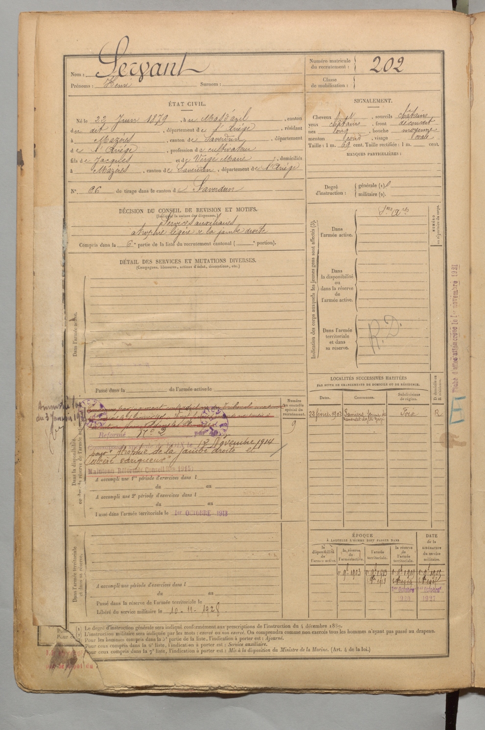 | Servant | Henri | FOIX | 1 R 456 | 1899 | Mas-d'Azil (Le) | Mazères | 202 |