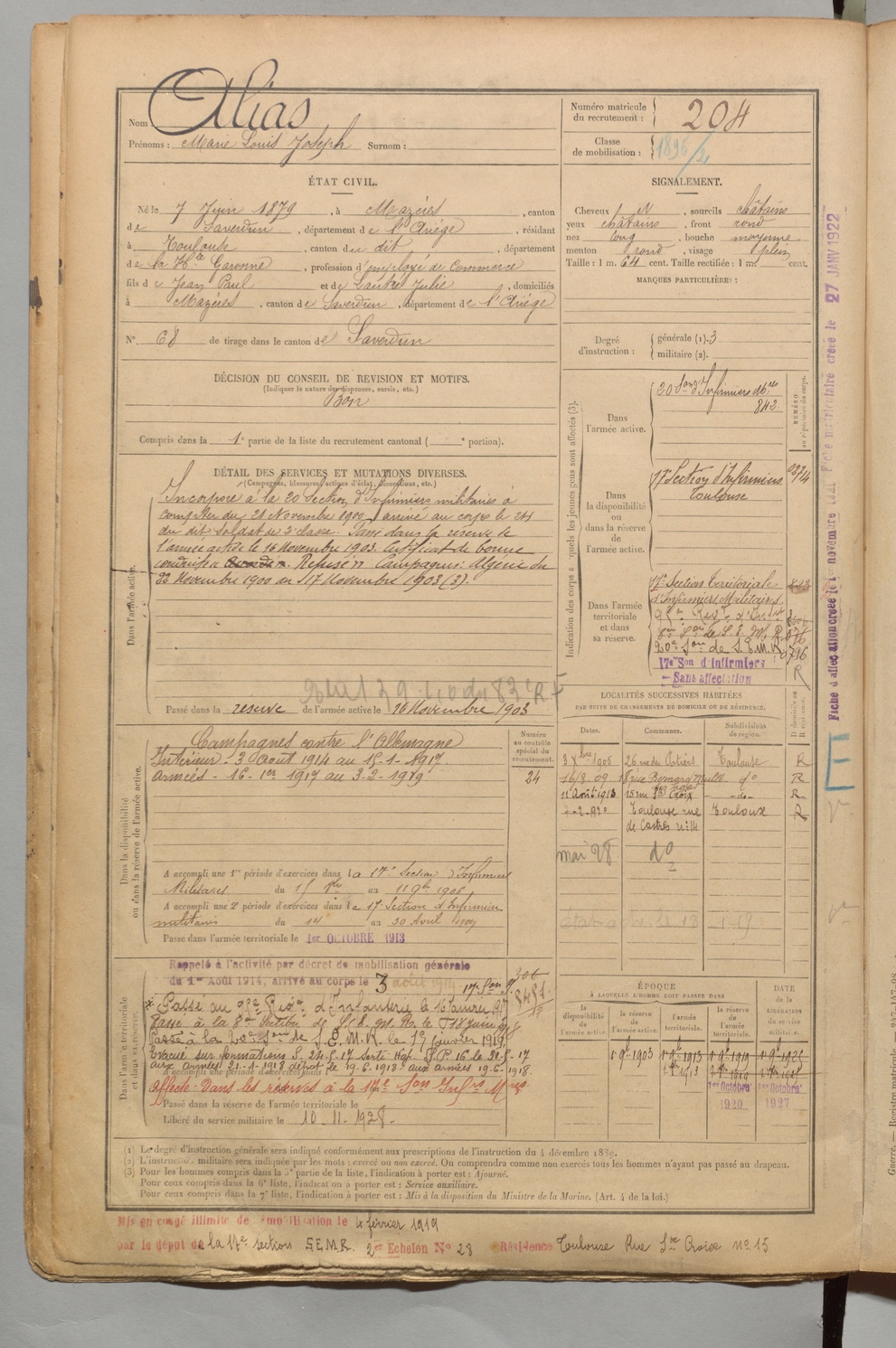| Allias | Marie Louis Joseph | FOIX | 1 R 456 | 1899 | Mazères | Toulouse | 204 |