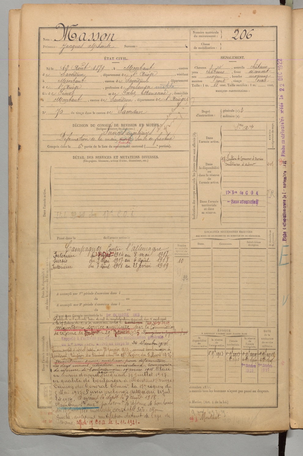 | Masson | Jacques Alphonse | FOIX | 1 R 456 | 1899 | Montaut | Montaut | 206 |