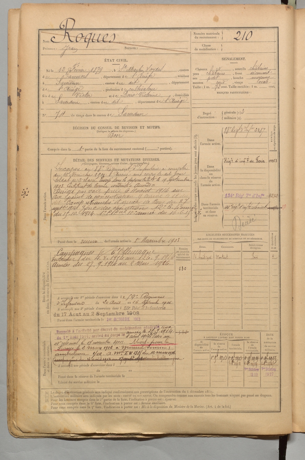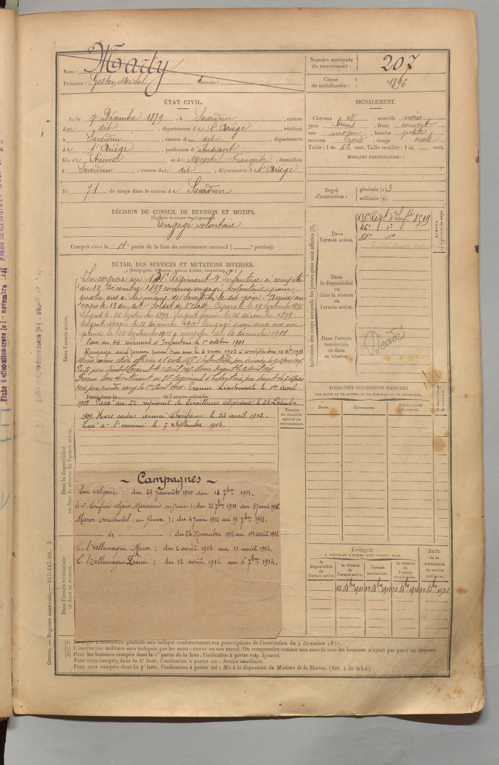| Marty | Gaston Michel | FOIX | 1 R 456 | 1899 | Saverdun | Saverdun | 207 |