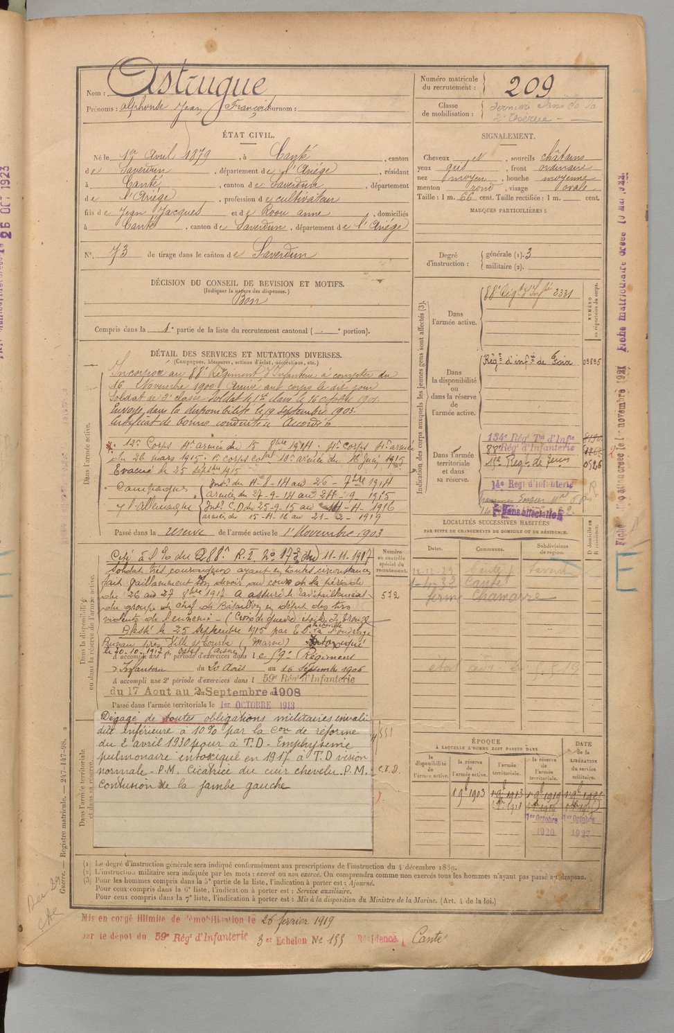 | Astrugue | Alphonse Jean François | FOIX | 1 R 456 | 1899 | Canté | Canté | 209 |