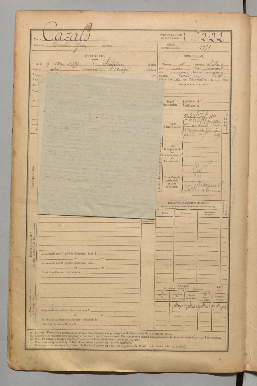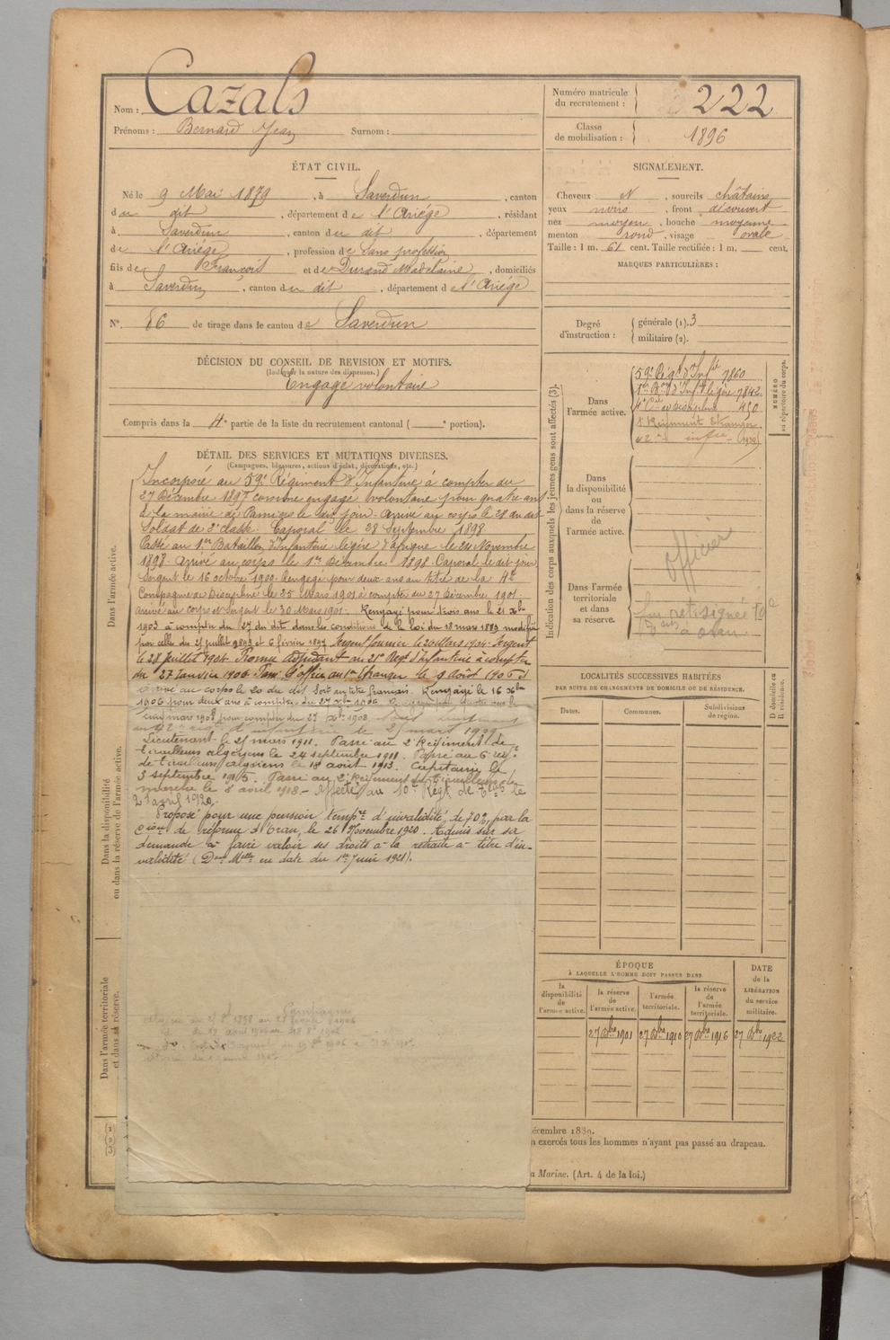 | Cazals | Bernard Jean | FOIX | 1 R 456 | 1899 | Saverdun | Saverdun | 222 |