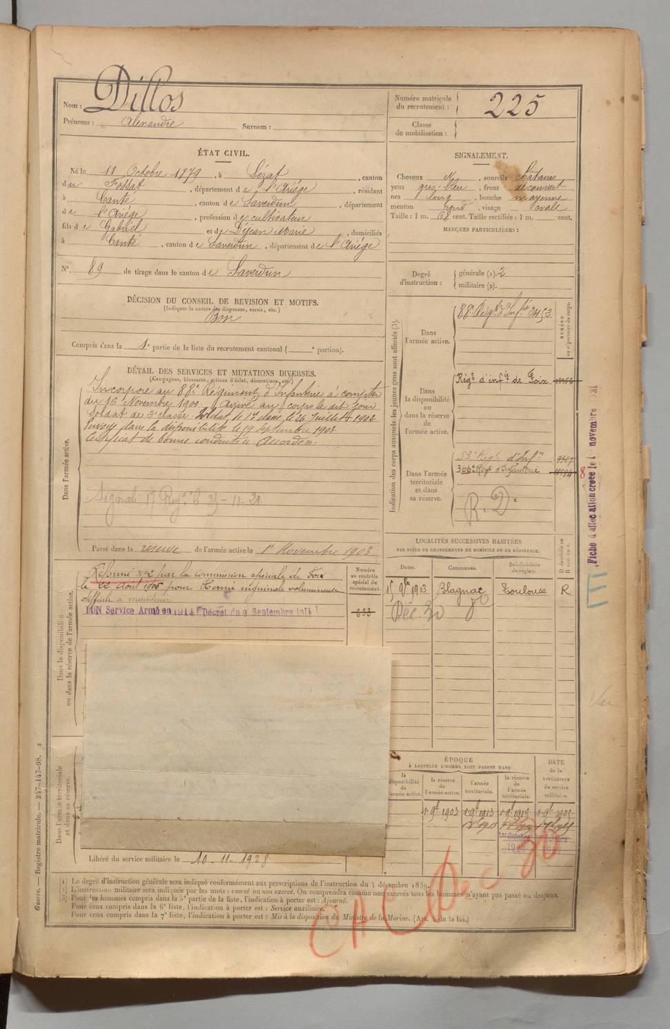 | Dillos | Alexandre | FOIX | 1 R 456 | 1899 | Lézat-sur-Lèze | Canté | 225 |