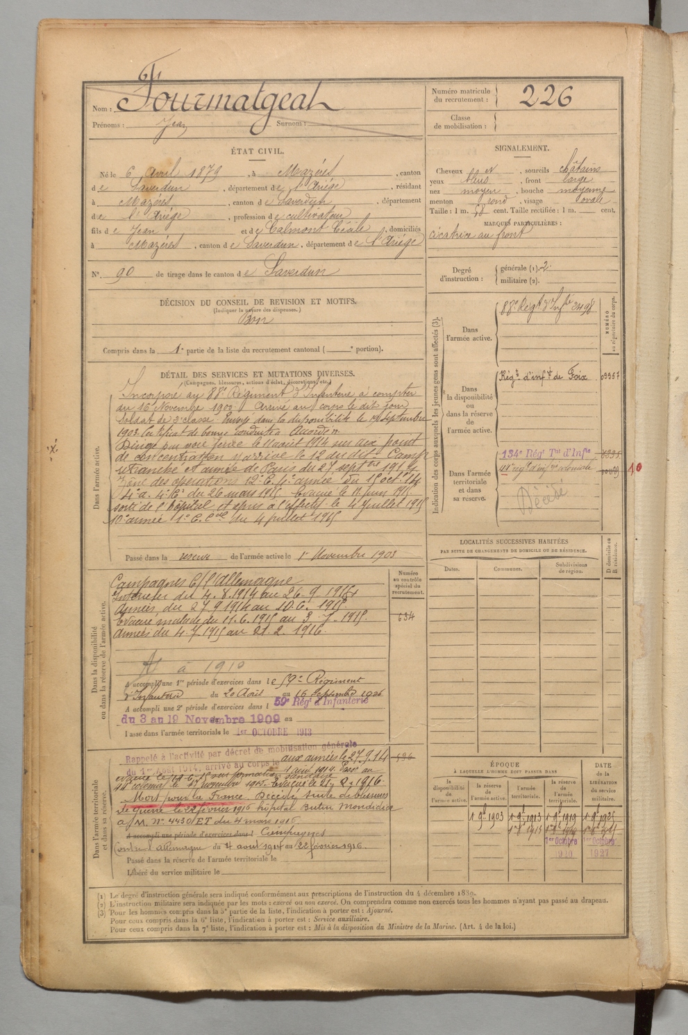 | Foiurmatgeat | Jean | FOIX | 1 R 456 | 1899 | Mazères | Mazères | 226 |