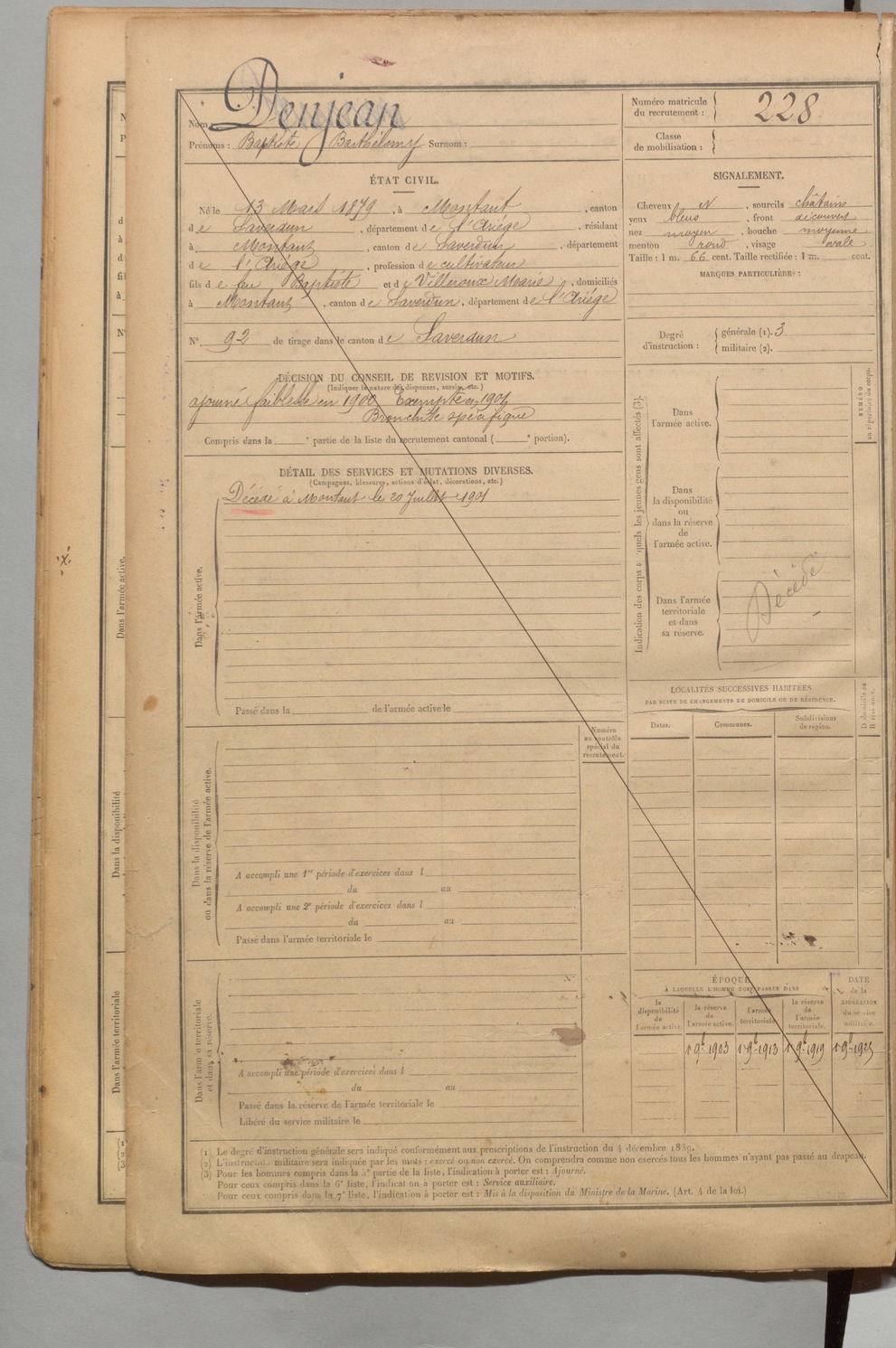 | Denjean | Baptiste Barthélemy | FOIX | 1 R 456 | 1899 | Montaut | Montaut | 228 |