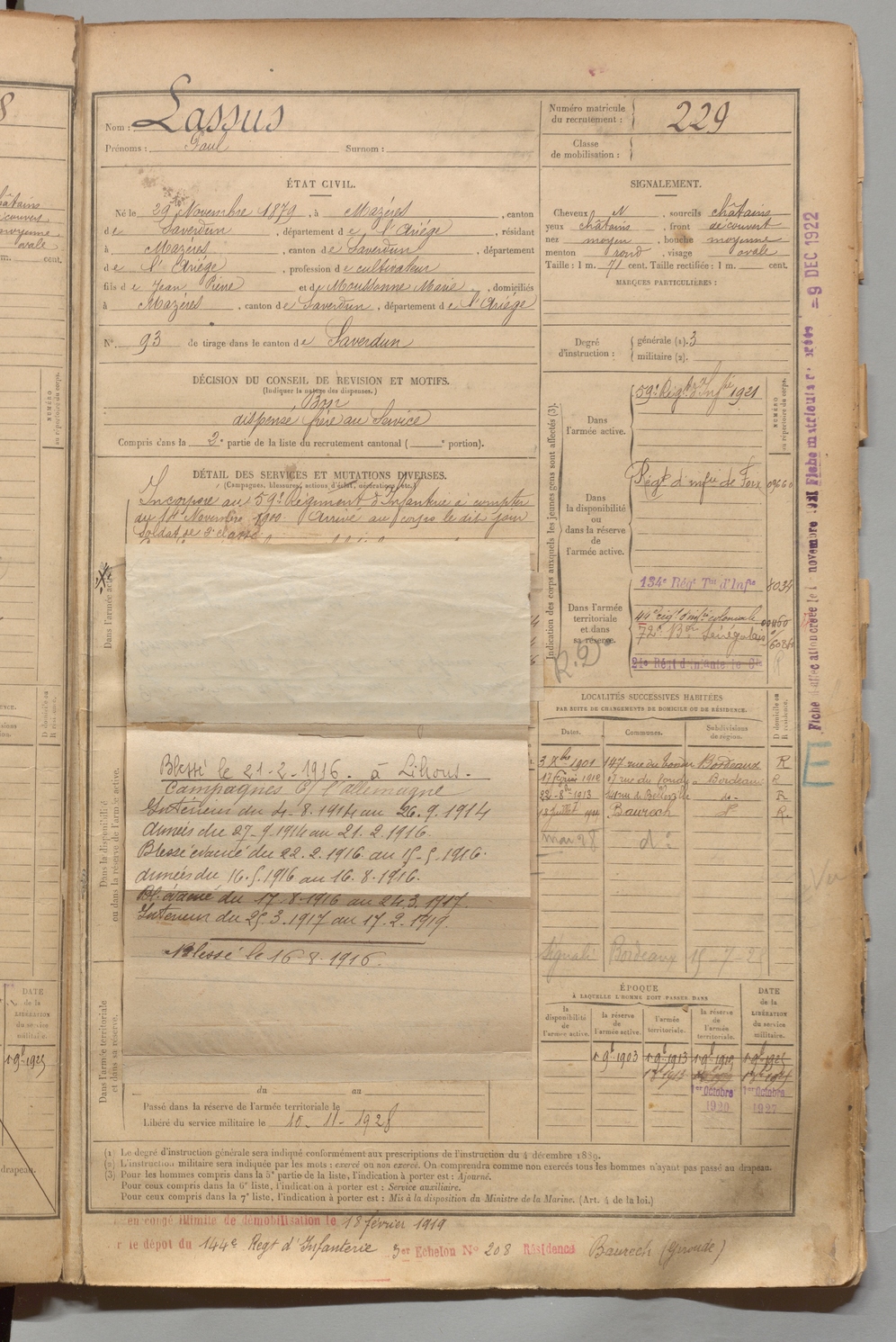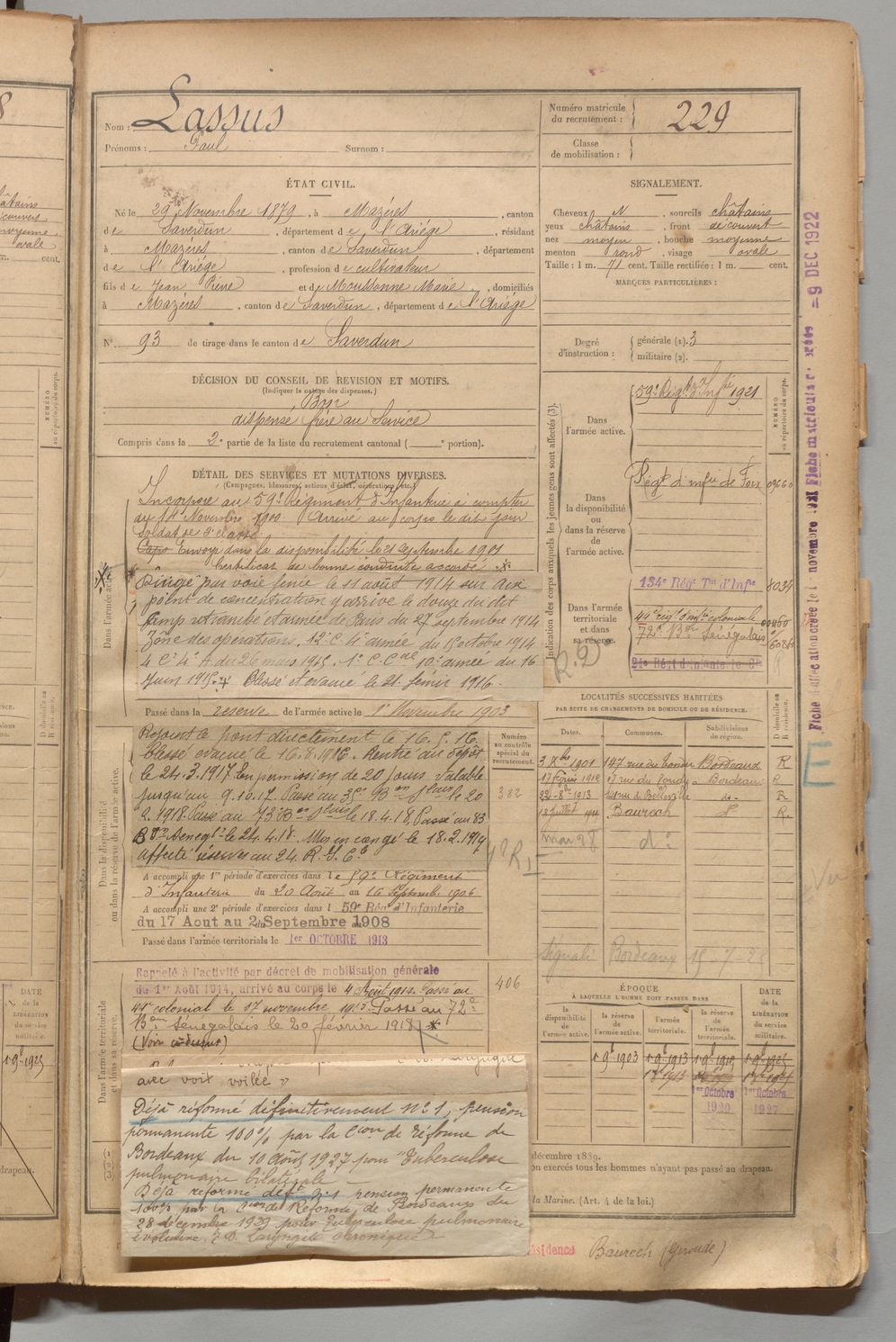 | Lassus | Paul | FOIX | 1 R 456 | 1899 | Mazères | Mazères | 229 |