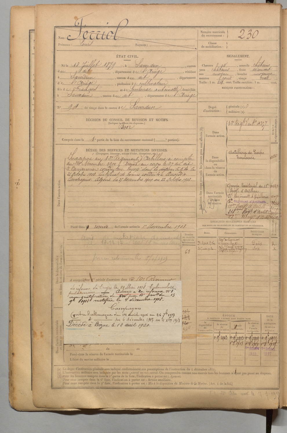 | Ferriol | Louis | FOIX | 1 R 456 | 1899 | Saverdun | Saverdun | 230 |